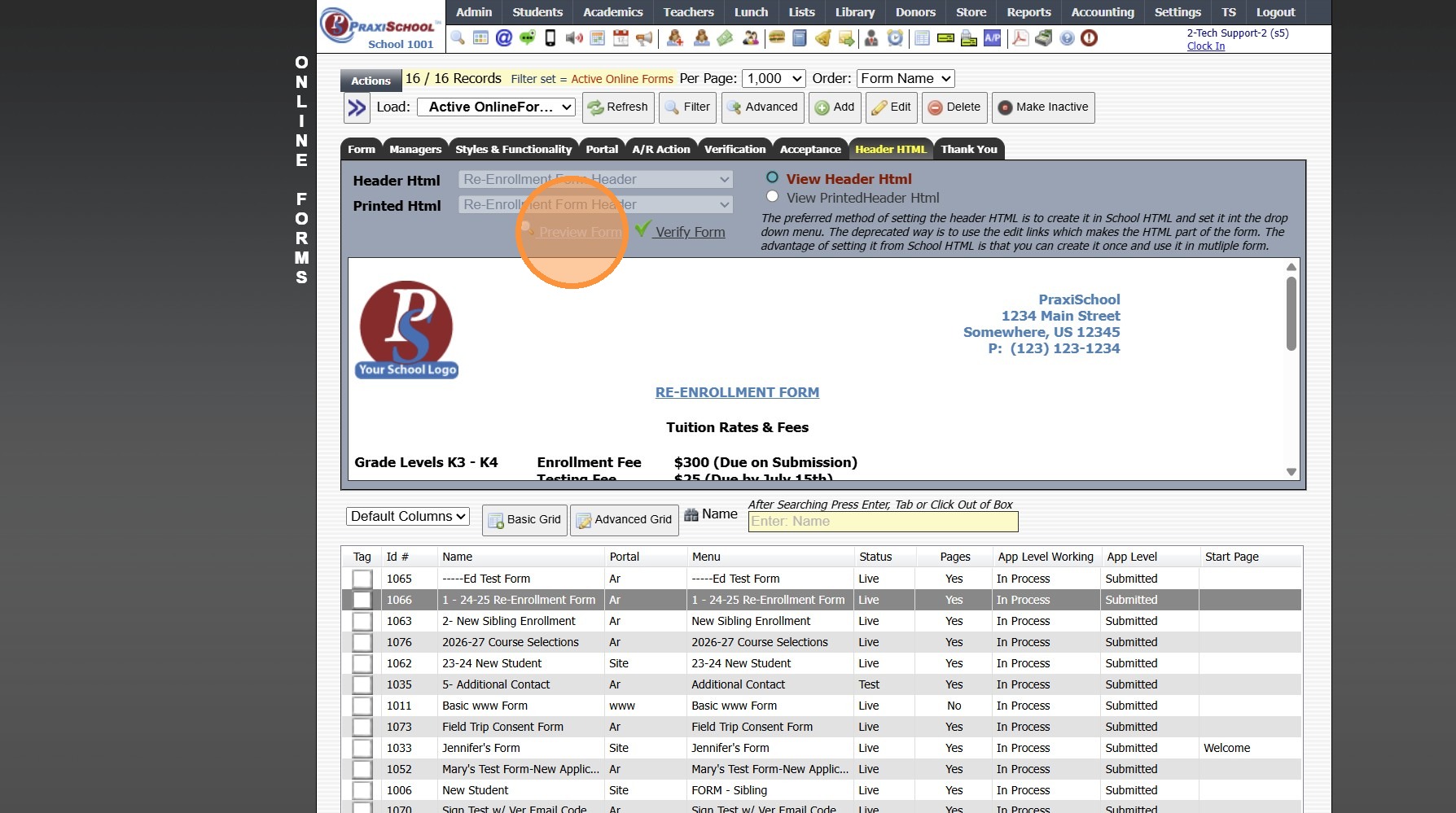 Example Re-Enrollment Form 1. Click "Admin" 2. Click "Online Forms" 3. Click "Forms" 4. Select Form & Click "Edit" 5. Click "Live" 6. Click "Save" 1000.6.10