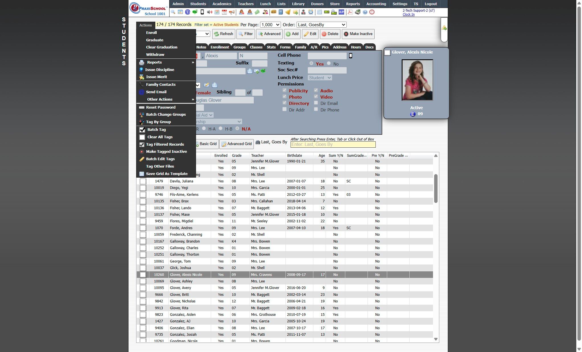 Printing Student Contact Sheets in Batch 1. Log into PraxiSchool 2. Click "Students" 3. Click "Students" 4. Click "Actions" 5. Click "Contact Sheets" 6. Select Print For Option (Single, Active, Tagged, Grade Level, Class OR Homeroom Teacher) 7. ...