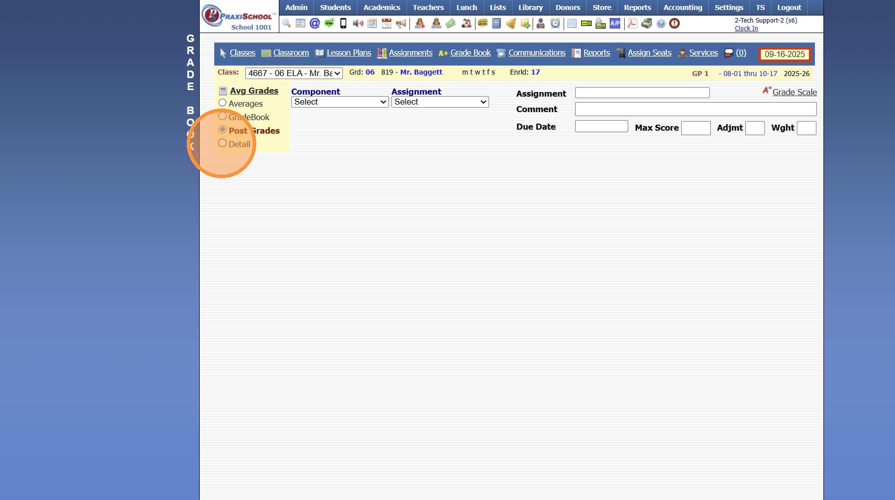 Moving Assignments and Grades to Correct Grade Period 1. Log into PraxiSchool 2. Click "Teachers" 3. Click "Classroom" 4. Select Class 5. Click "Assignments" 6. Select Component 7. Select Assignment 8. Click "Change Grade Period / Component" 9. ...