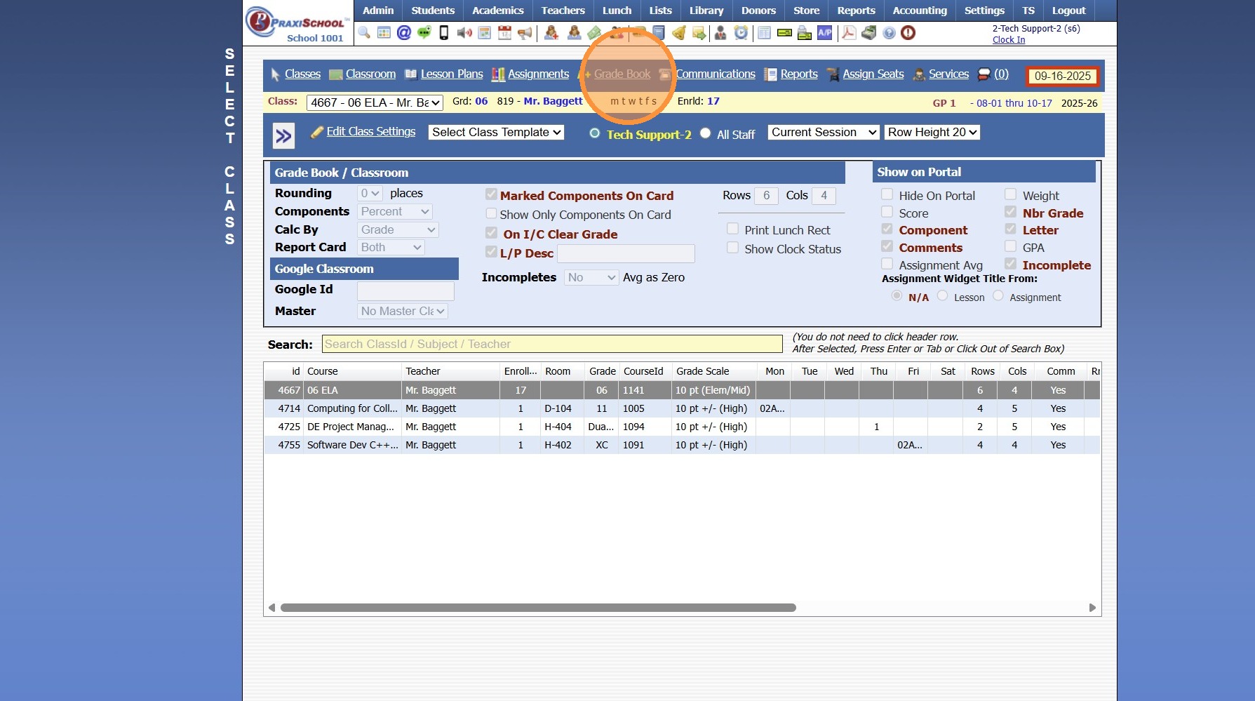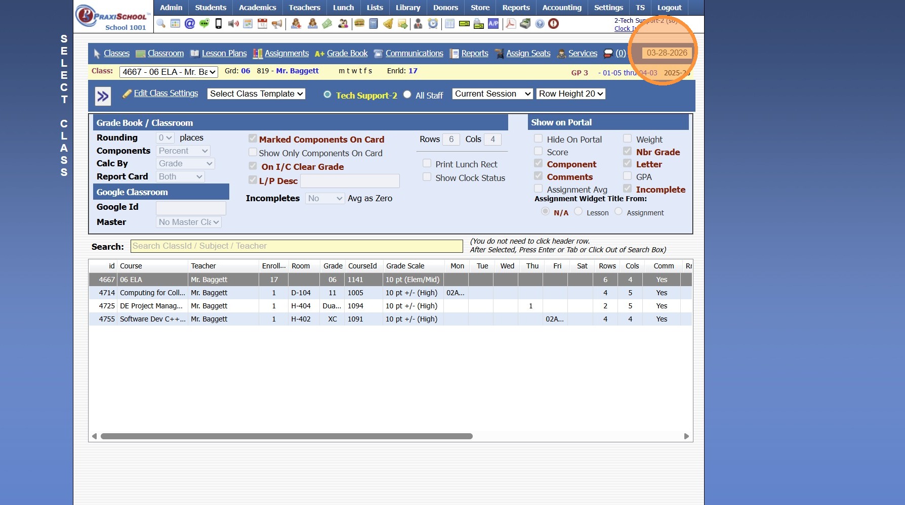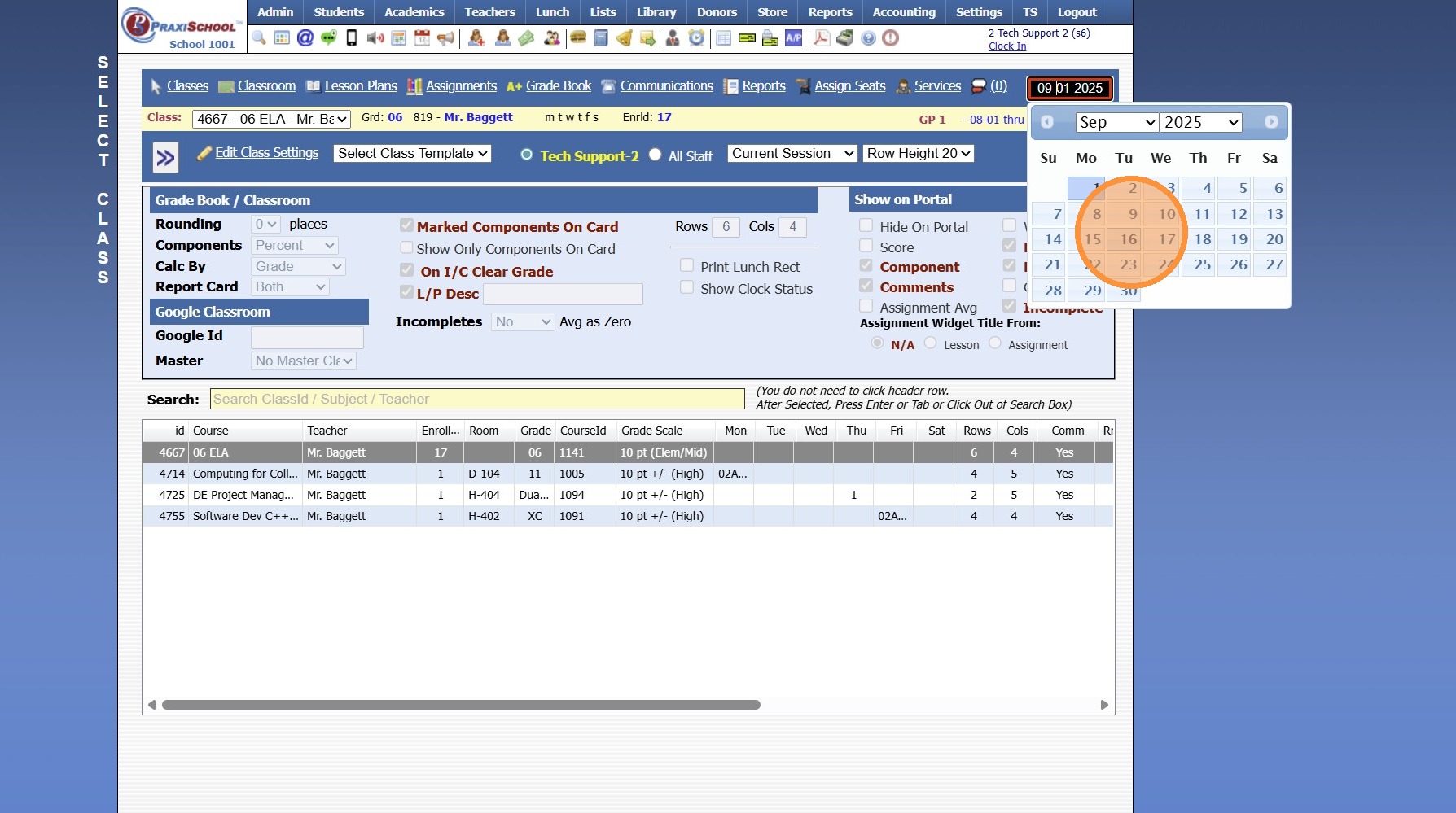 Selecting a Grade Period Date in the Classroom 1. Click "Teachers" 2. Click "Classroom" 3. Click the Date Field and Select the Date in the Grade Period 2500.1.2