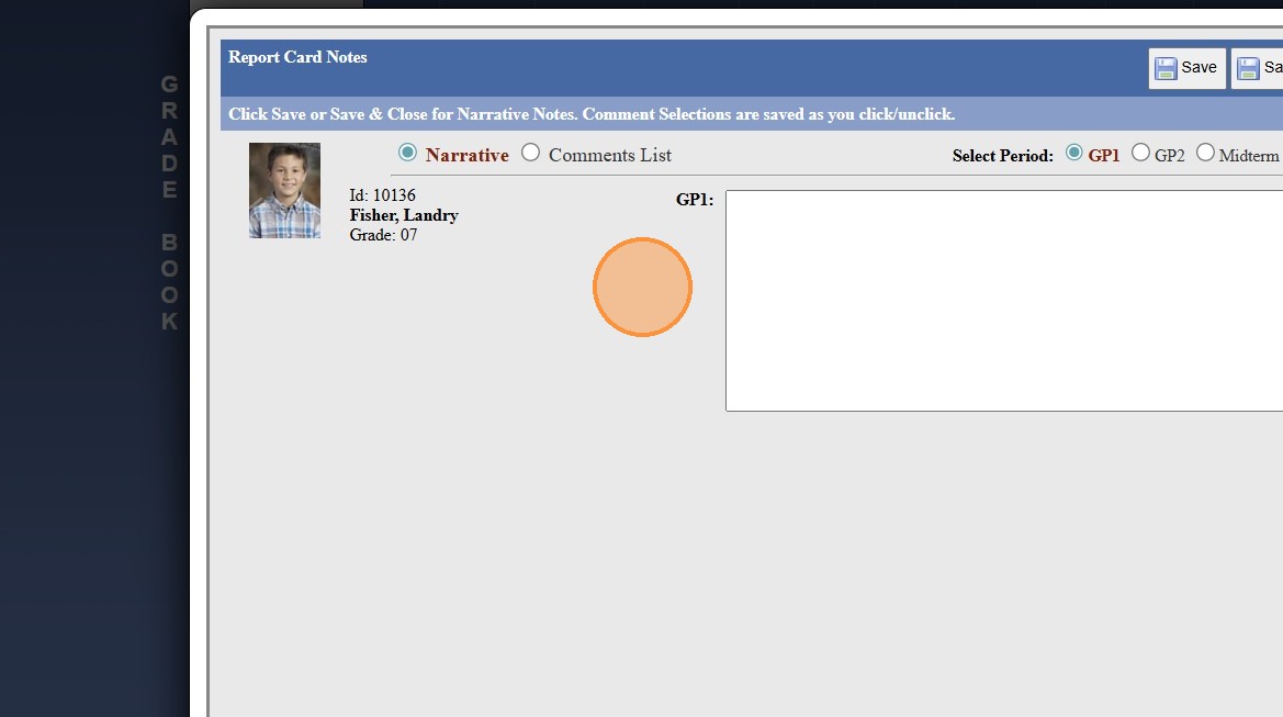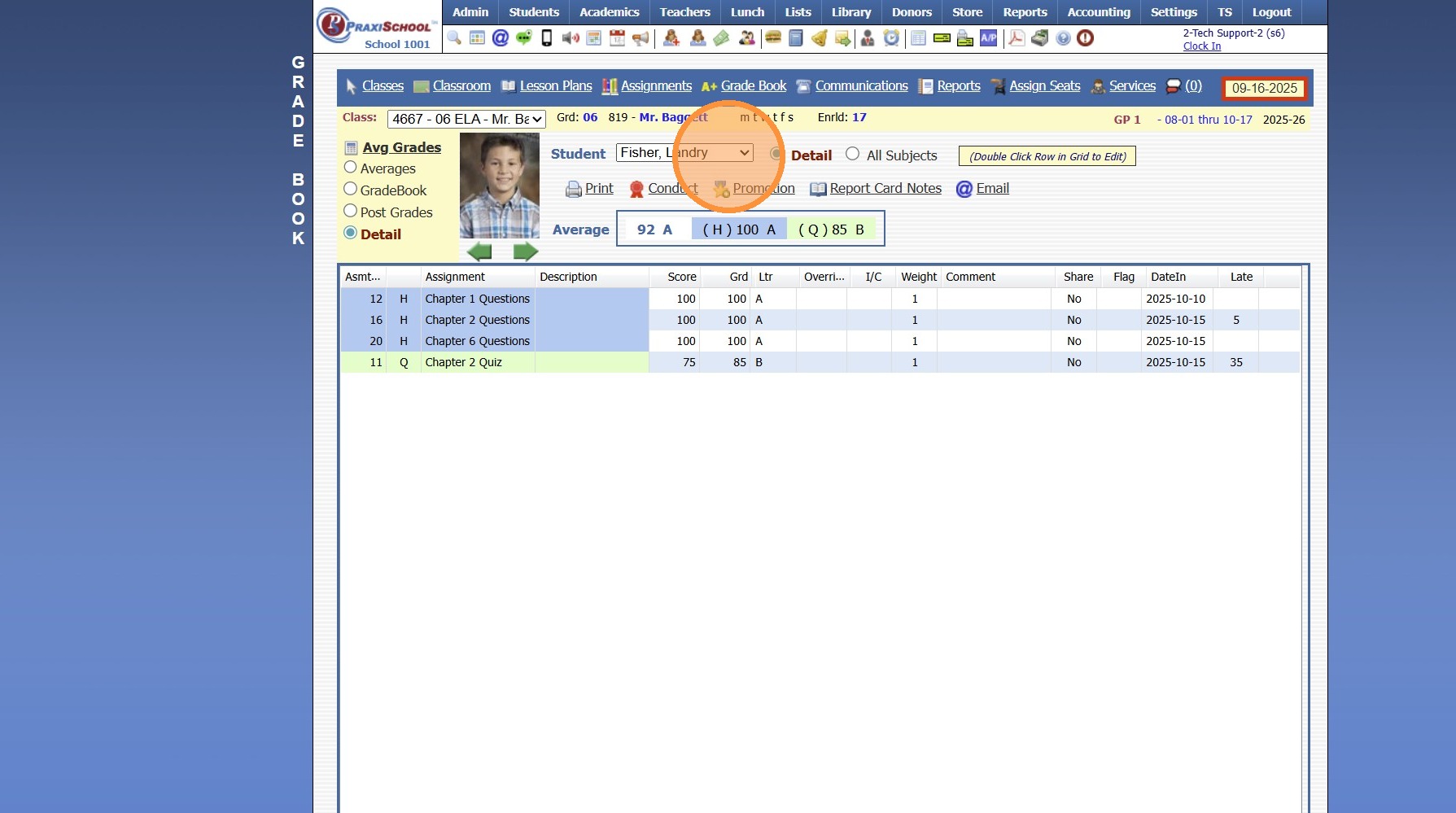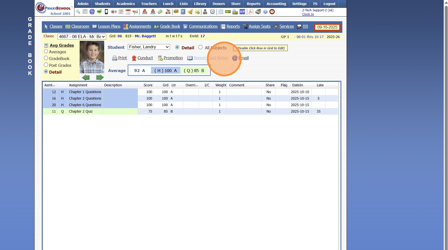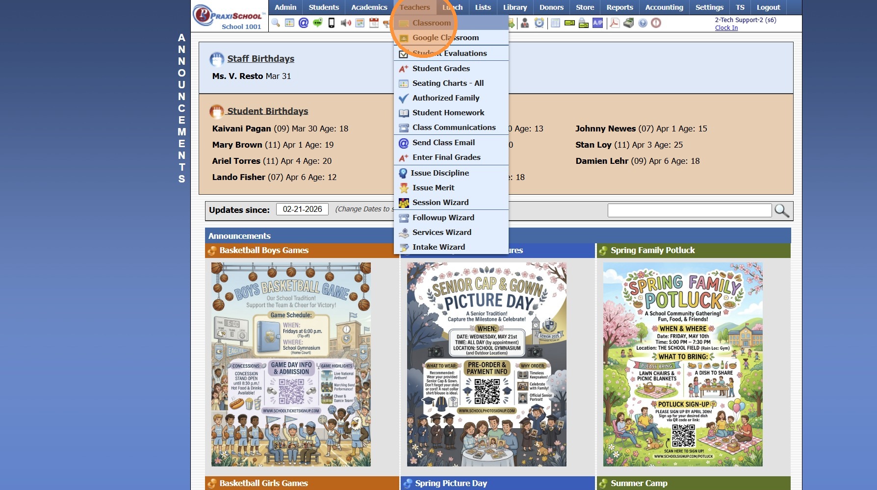Selecting a Grade Period Date in the Classroom 1. Click "Teachers" 2. Click "Classroom" 3. Click the Date Field and Select the Date in the Grade Period 2500.1.2