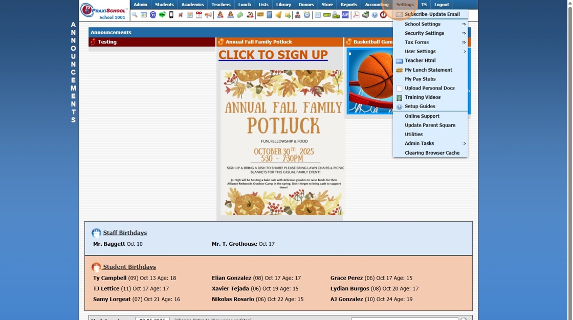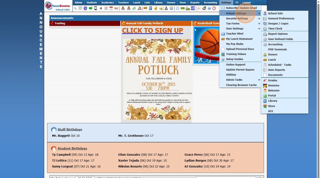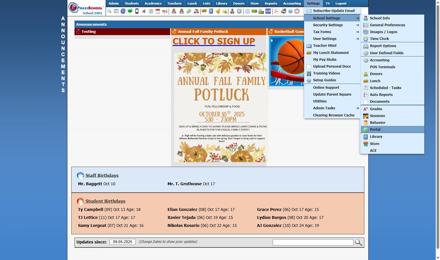 Creating School Calendar Items 1. Log into PraxiSchool 2. Click "Admin" 3. Click "Resources" 4. Click "School Calendar" 5. Click "Add" 6. Enter the Calendar Item Description 7. Select Type (Public, No School, Make-Up, Staff) Public, No School and ...