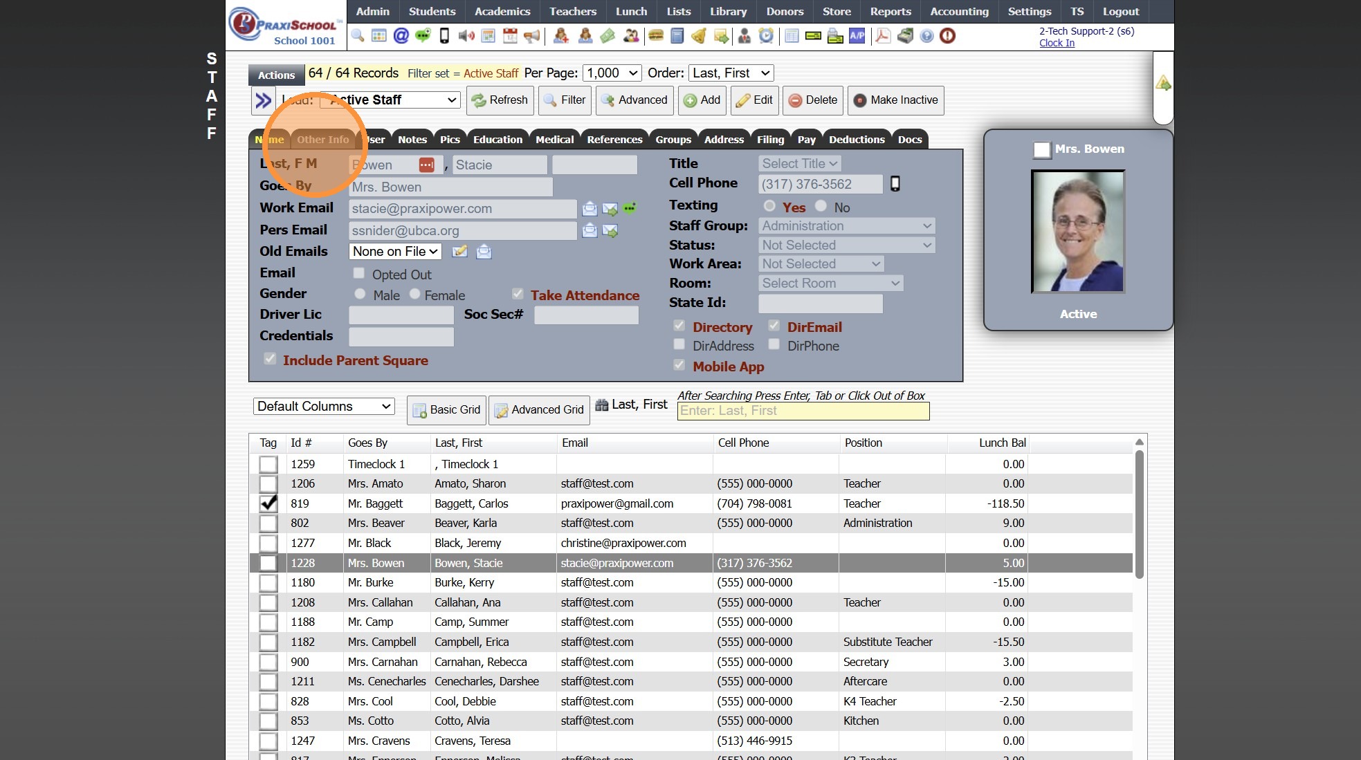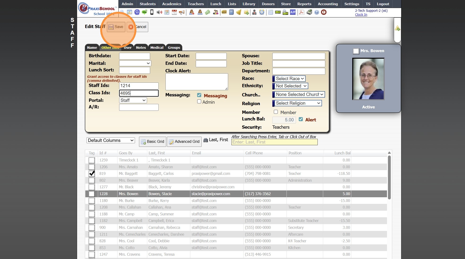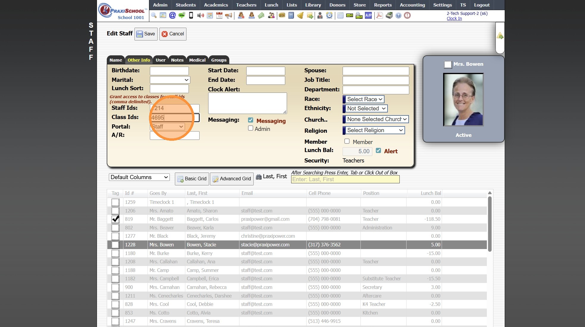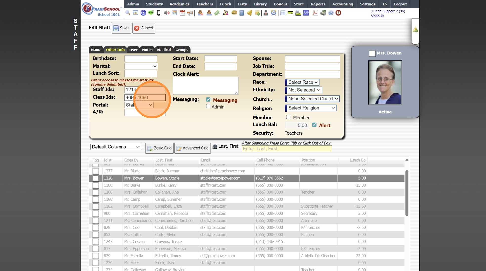 Sharing a Teacher's Class with Another Staff 1. Click "Admin" 2. Click "Staff" 3. Click "Staff" 4. Select Staff to Share With 5. Click "Other Info" 6. Click "Edit" 7. Enter Class ID of Class(es) being Shared (Class ID Numbers should be separated by a ...