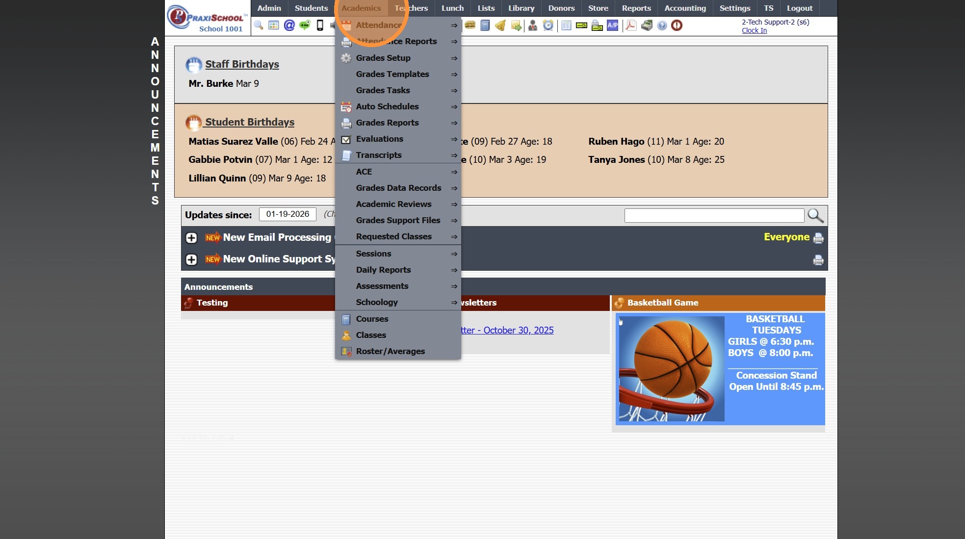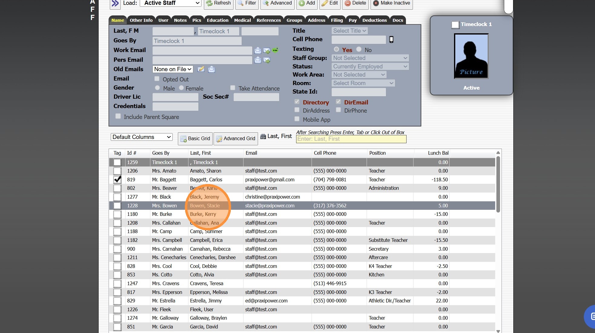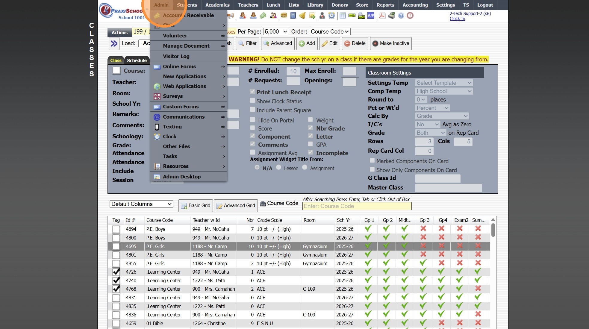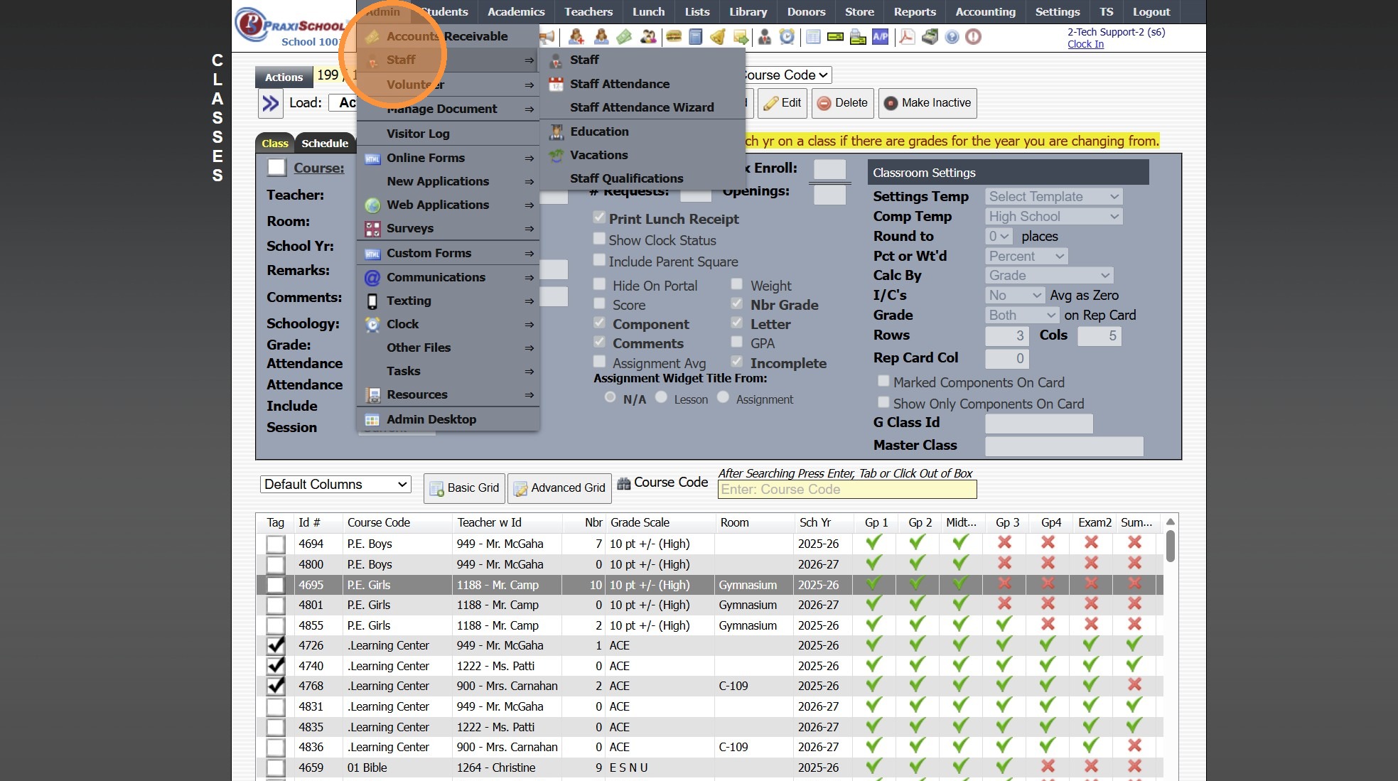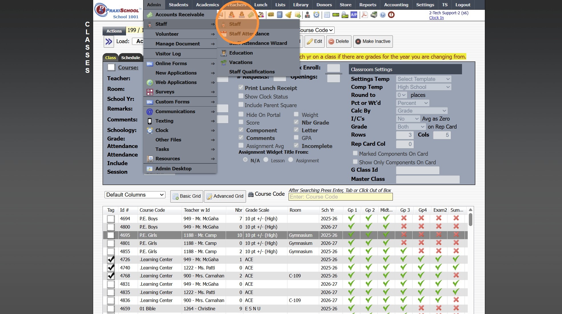 Viewing All Teacher's Classes 1. Click "Teachers" 2. Click "Classroom" 3. Logged in Staff Classes are visible 4. Click "All Staff" to View All Staff's Classes 5. All Staff Classes are Visible 6. 2500.1.4
