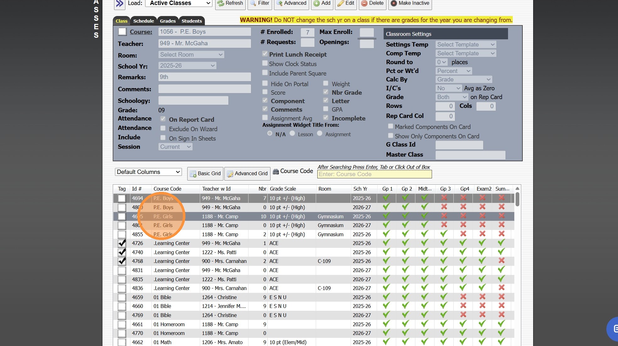 A Course must be Created before the Class can be Added. 1. Click "Academics" 2. Click "Classes" 3. Click "Add" 4. Search Course Name 5. Select Teacher 6. Select Classroom (Optional) 7. Verify the Correct School Year is Set (Current School Year is the ...