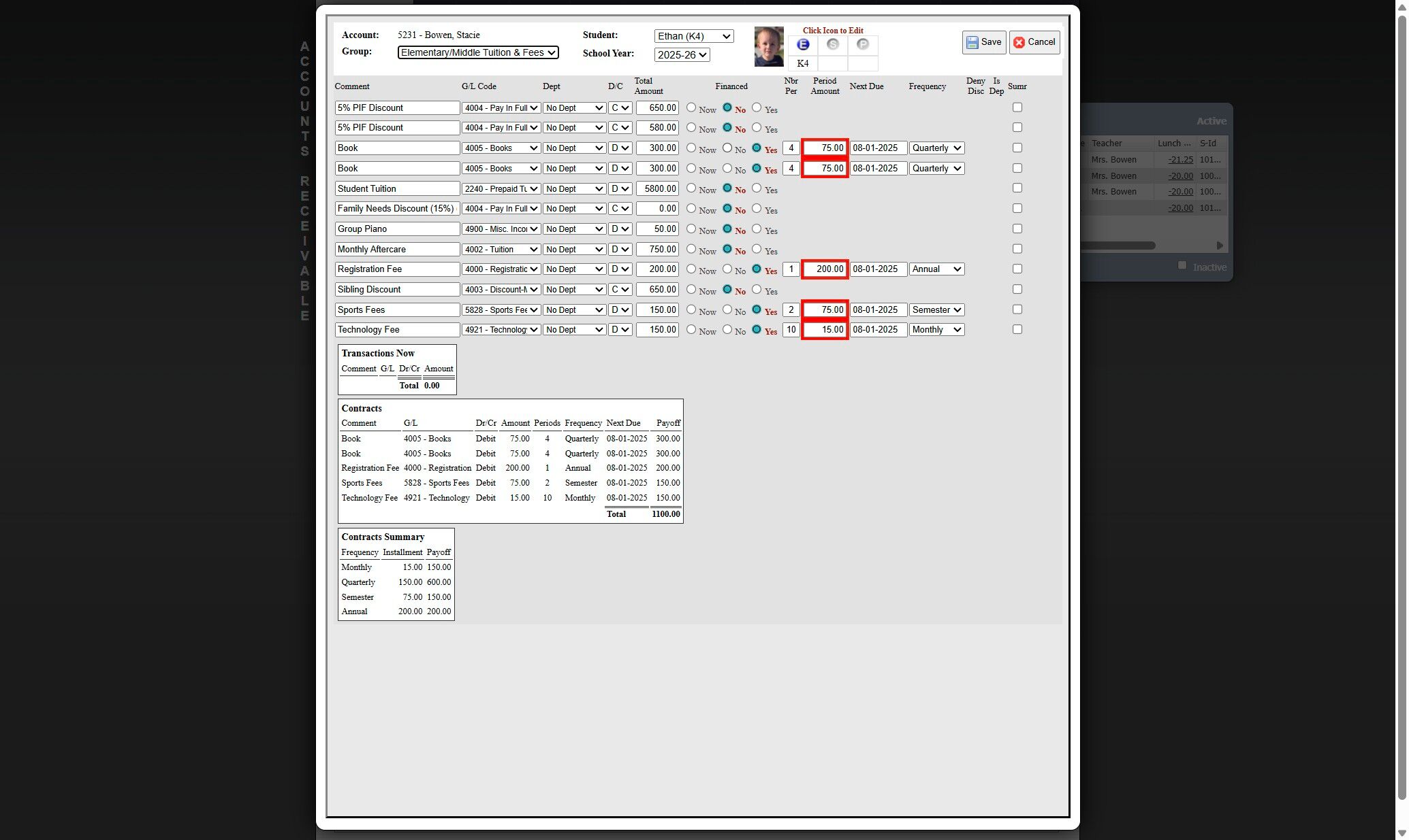 Students: Viewing Billing Contracts 1. Click "Students" 2. Click "Students" 3. Select Student 4. Click "A/R" tab 5. Summary - Default View View Contract Amounts by Billing Frequency 6. Detail View View Contract Details (Comment, General Ledger ...
