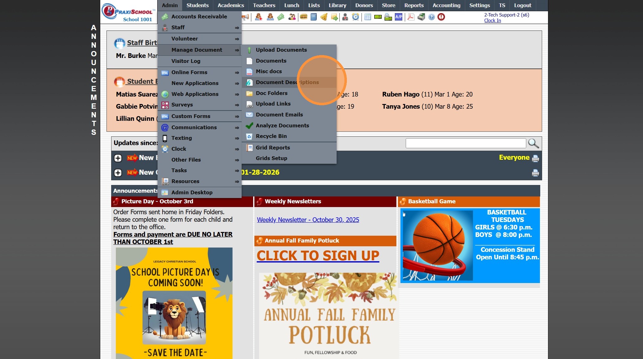 Creating Document Portal Upload Links 1. Click "Admin" 2. Click "Manage Document" 3. Click "Upload Links" 4. Click "Add" 5. Click the "Server Docs" field. 6. Enter a description for the document 7. Select the header if you want to group documents ...