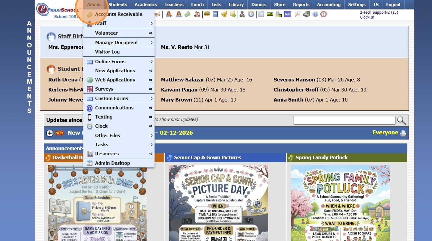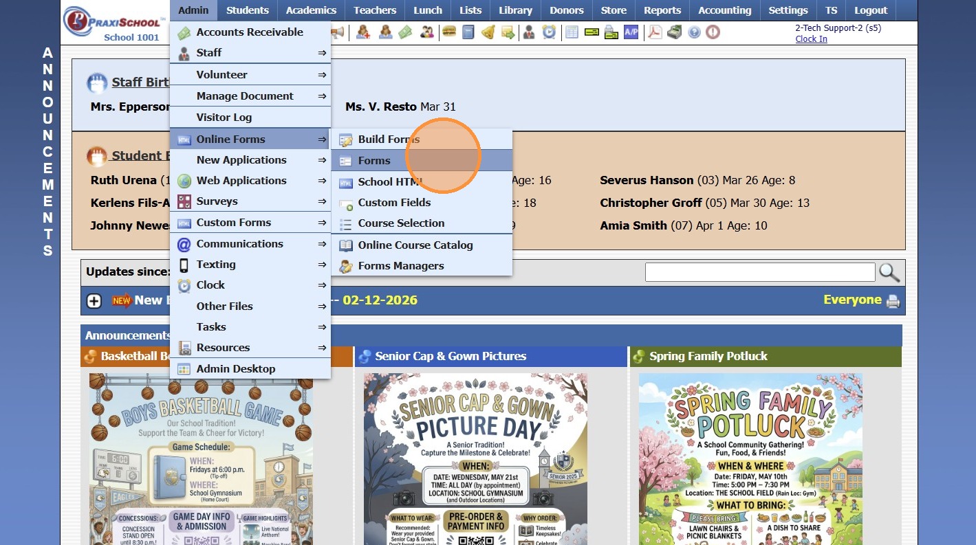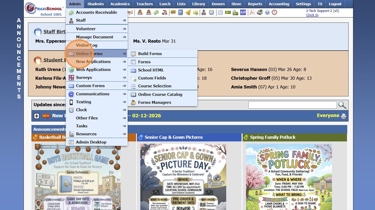 Online Forms Auto Start & End Dates 1. Click "Admin" 2. Click "Online Forms" 3. Click "Forms" 4. Select "Styles & Functionality" tab 5. Enter Auto Start & End Date and Time 1000.6.4