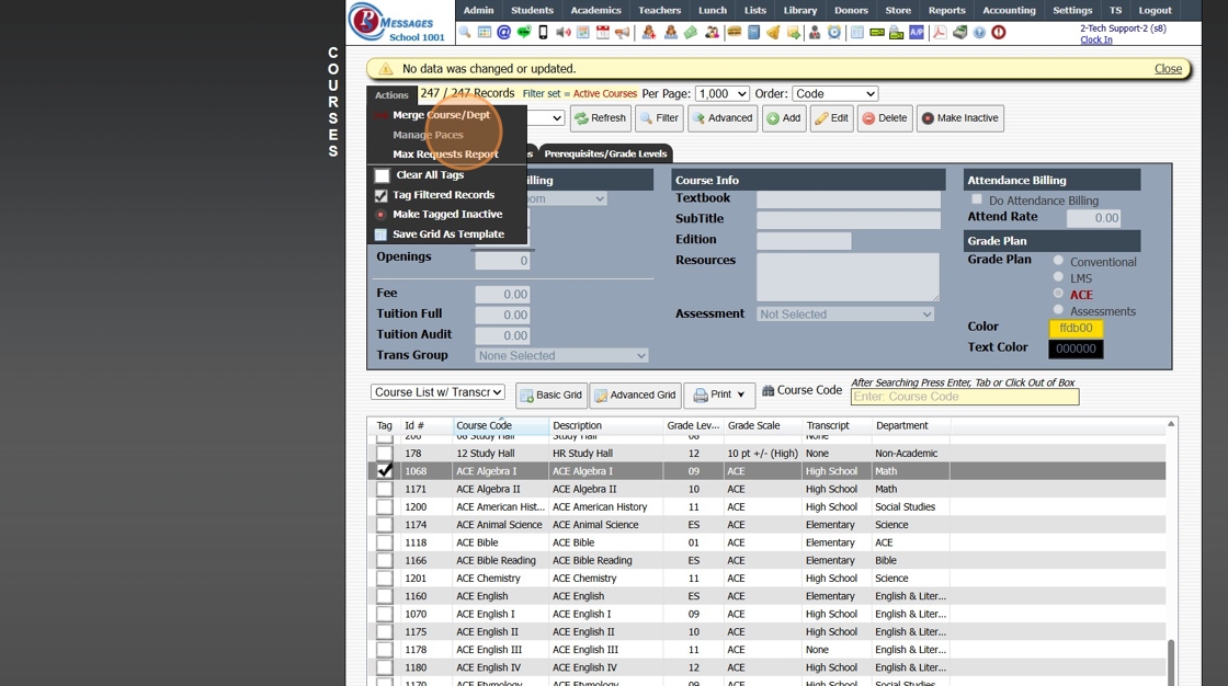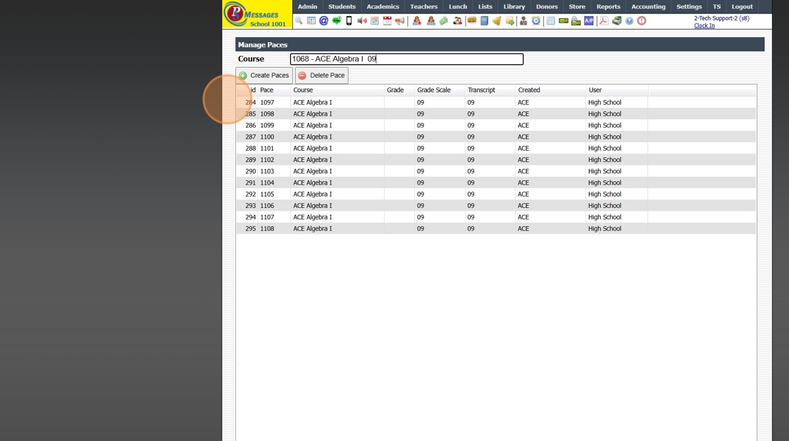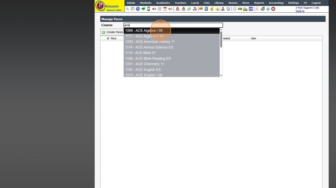 Adding / Removing PACES to ACE Courses 1. Click "Academics" 2. Click "Courses" 3. Click "Actions" 4. Click "Manage Paces" 5. Search the Course 6. Click "Create Paces" to Add New Paces or Select a Pace and Click "Delete Pace" to remove a Pace 7. If ...