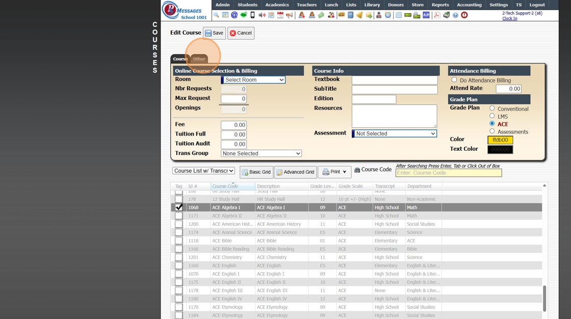 10. If Adding a New ACE Course, Click "Other" & Select the Grade Plan "ACE" and Select the Corresponding ACE Color for Course