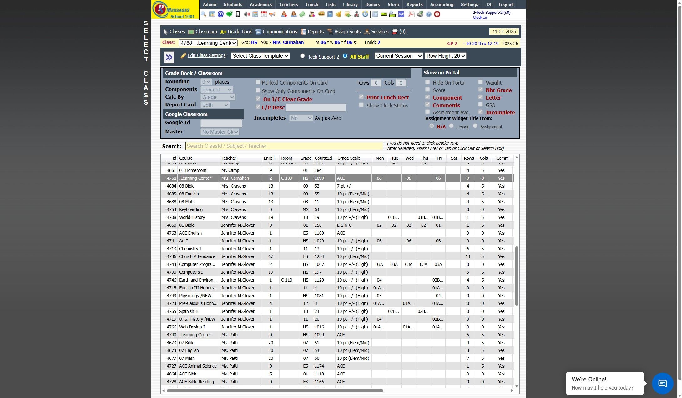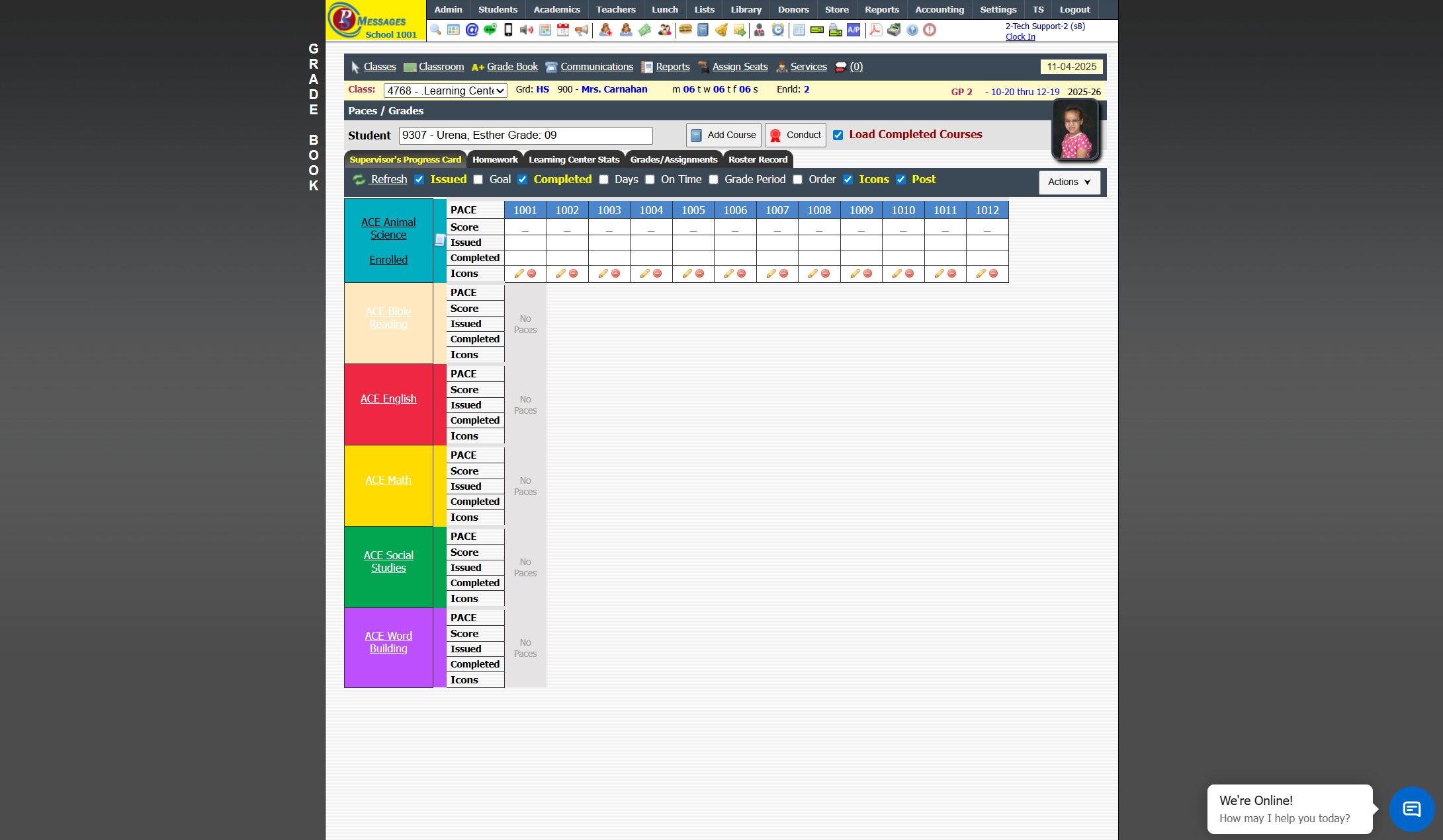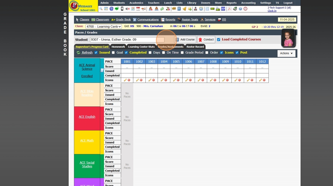 Enroll students in Courses and Assigning Paces 1. Click "Learning Center" 2. Click "Learning Center" 3. Select "Learning Center" Class and Click "Grade Book" 4. Click the student box and start typing the name 5. Select the name from the dropdown list ...