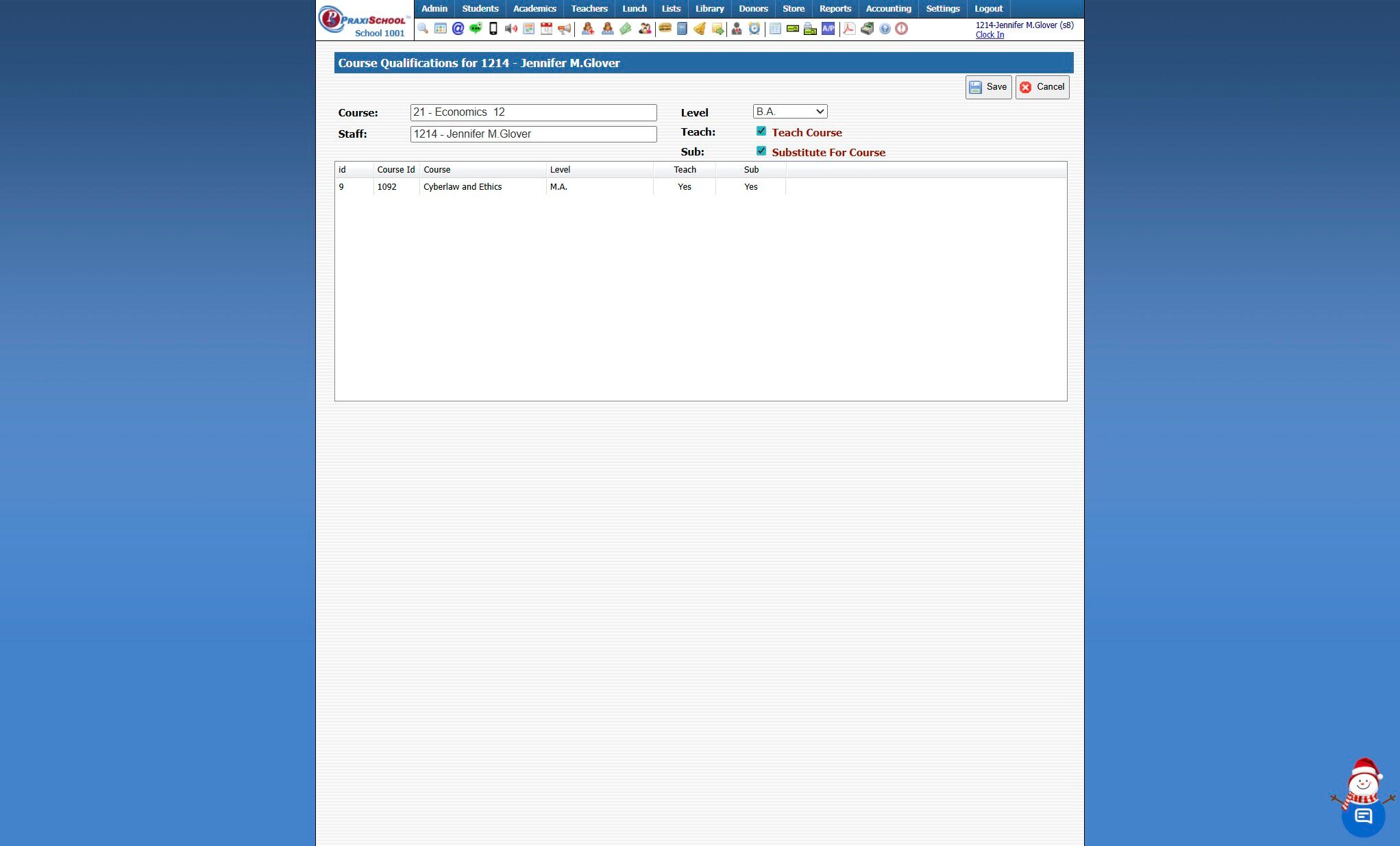 Adding Staff Qualifications 1. Click "Admin" 2. Click "Staff" 3. Click "Staff Qualifications" 4. Click "Add" 5. Select Course 6. Select Staff 7. Select Qualification Level 8. Check Teach Course if Staff is Qualified to teach the Course 9. Check Sub ...
