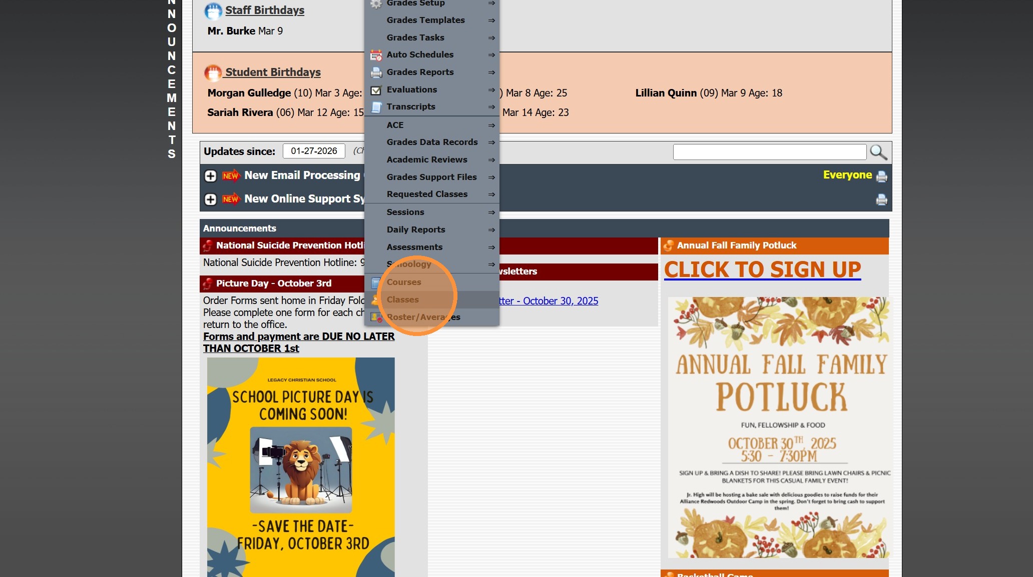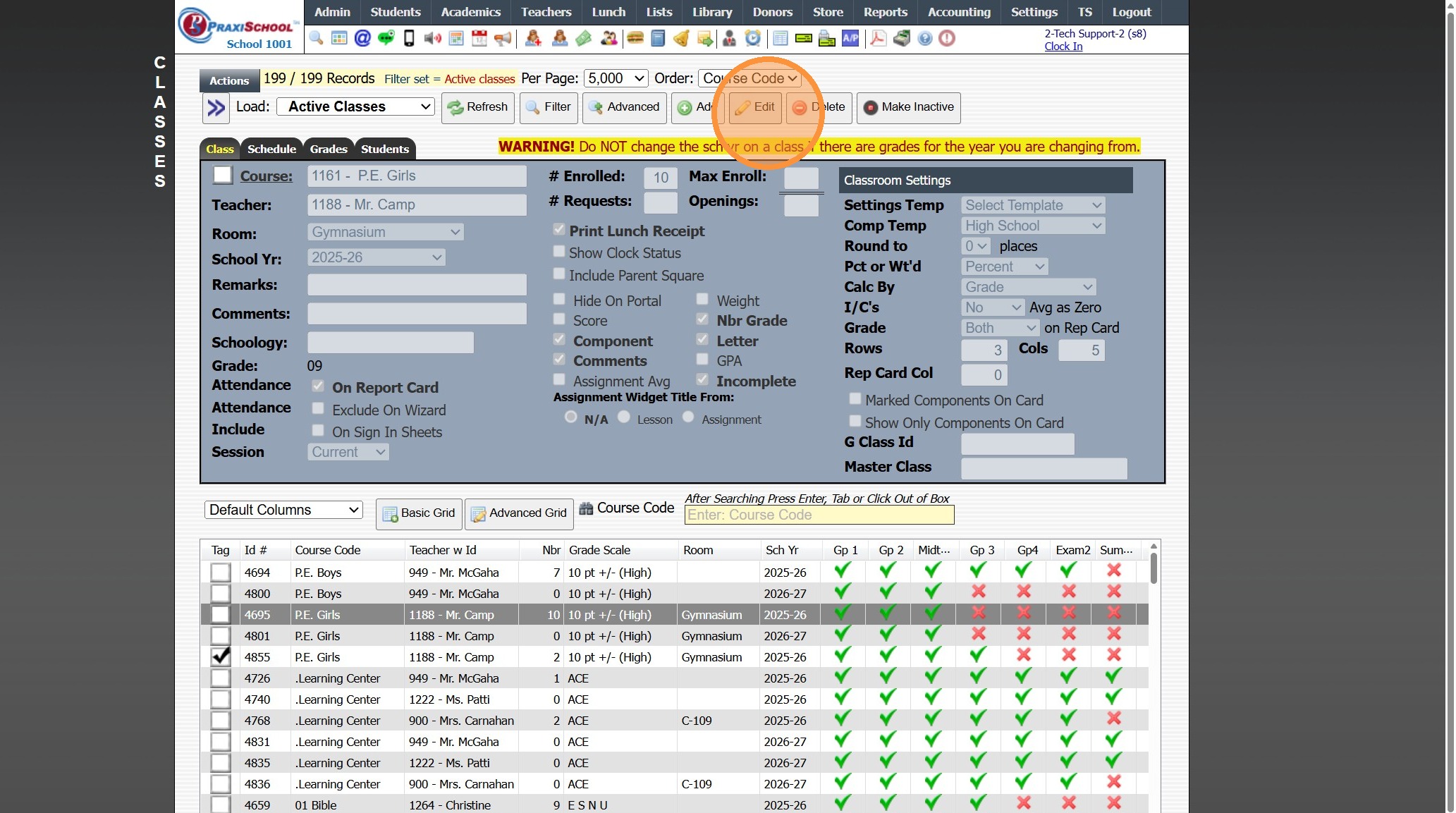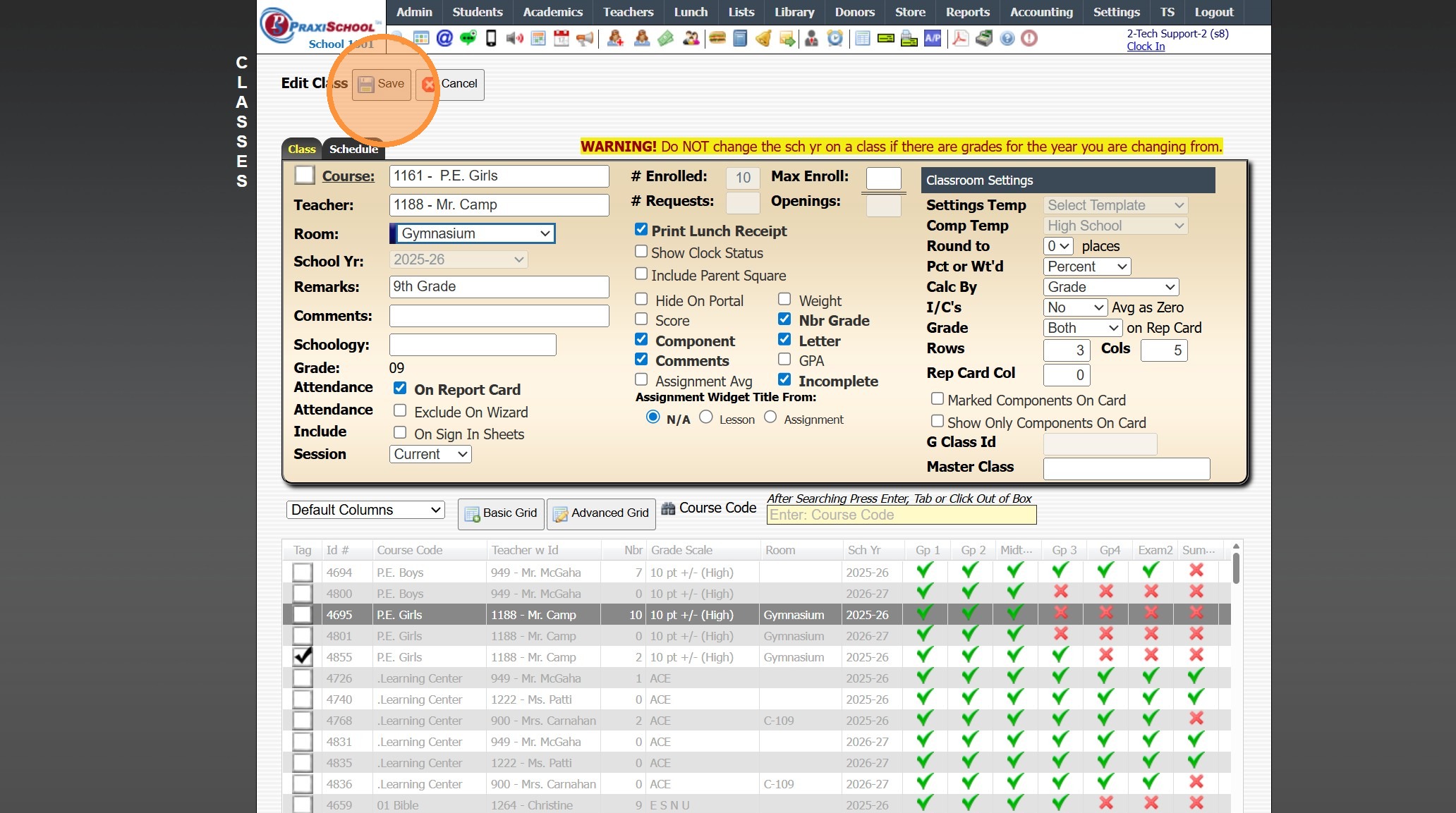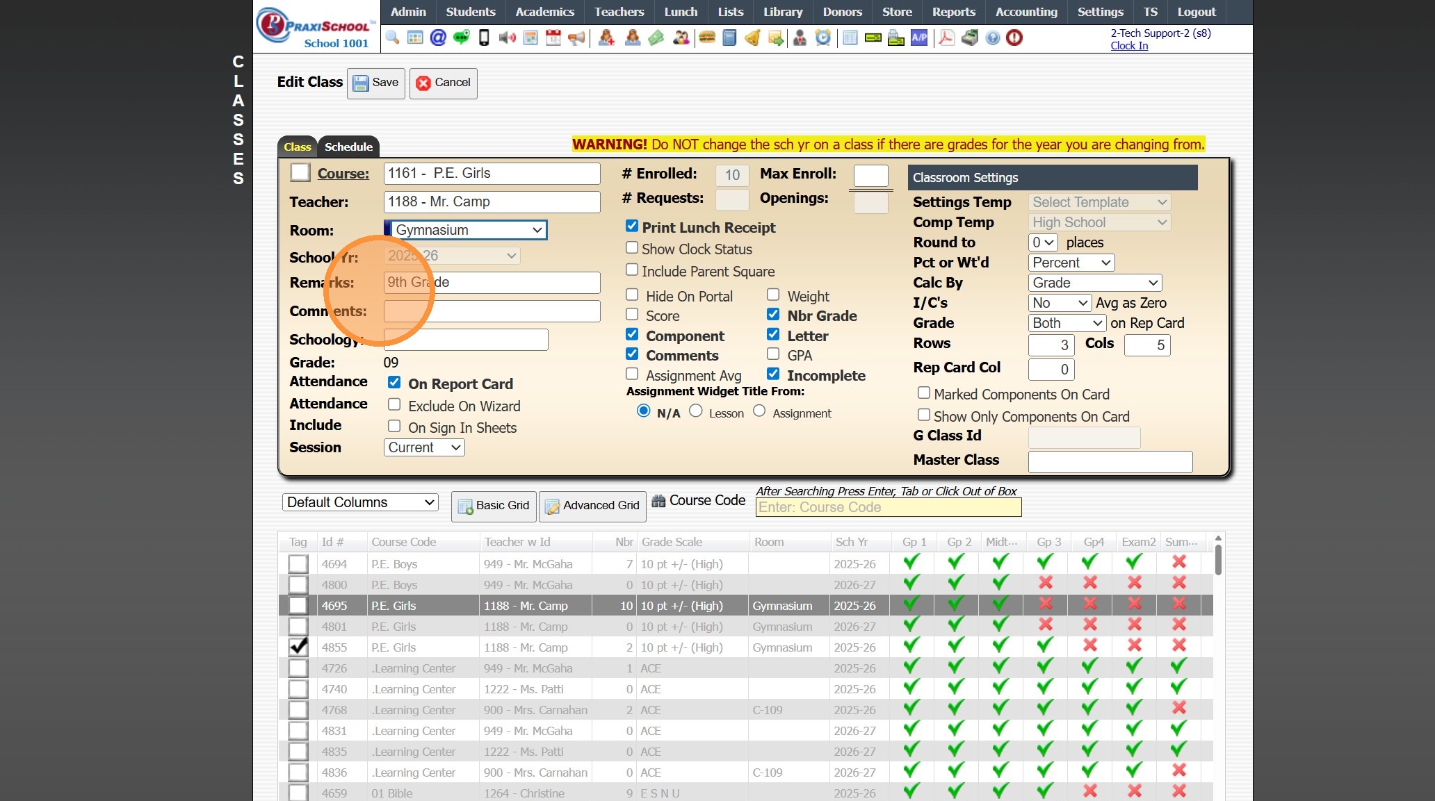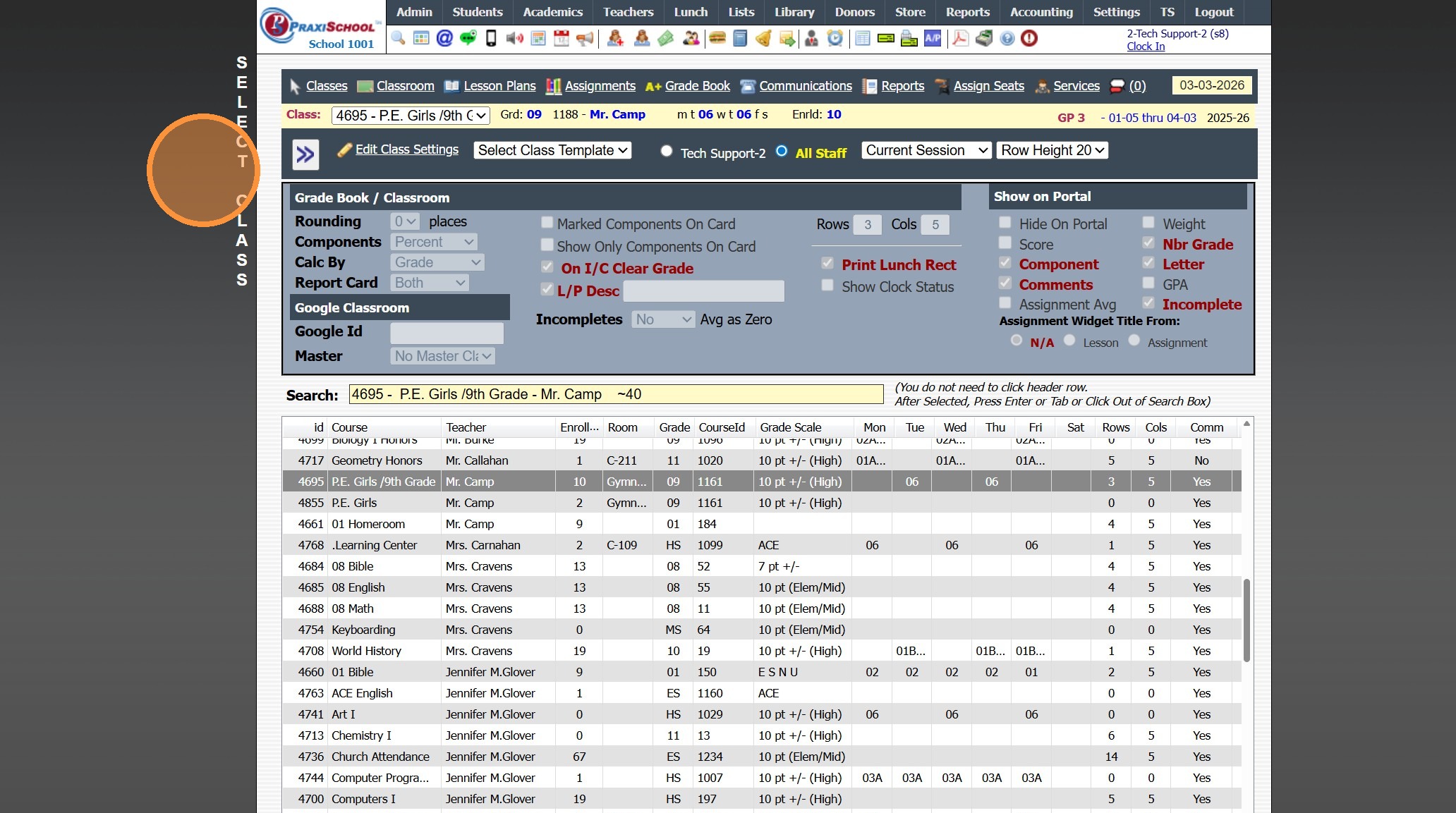 Viewing All Teacher's Classes 1. Click "Teachers" 2. Click "Classroom" 3. Logged in Staff Classes are visible 4. Click "All Staff" to View All Staff's Classes 5. All Staff Classes are Visible 6. 2500.1.4