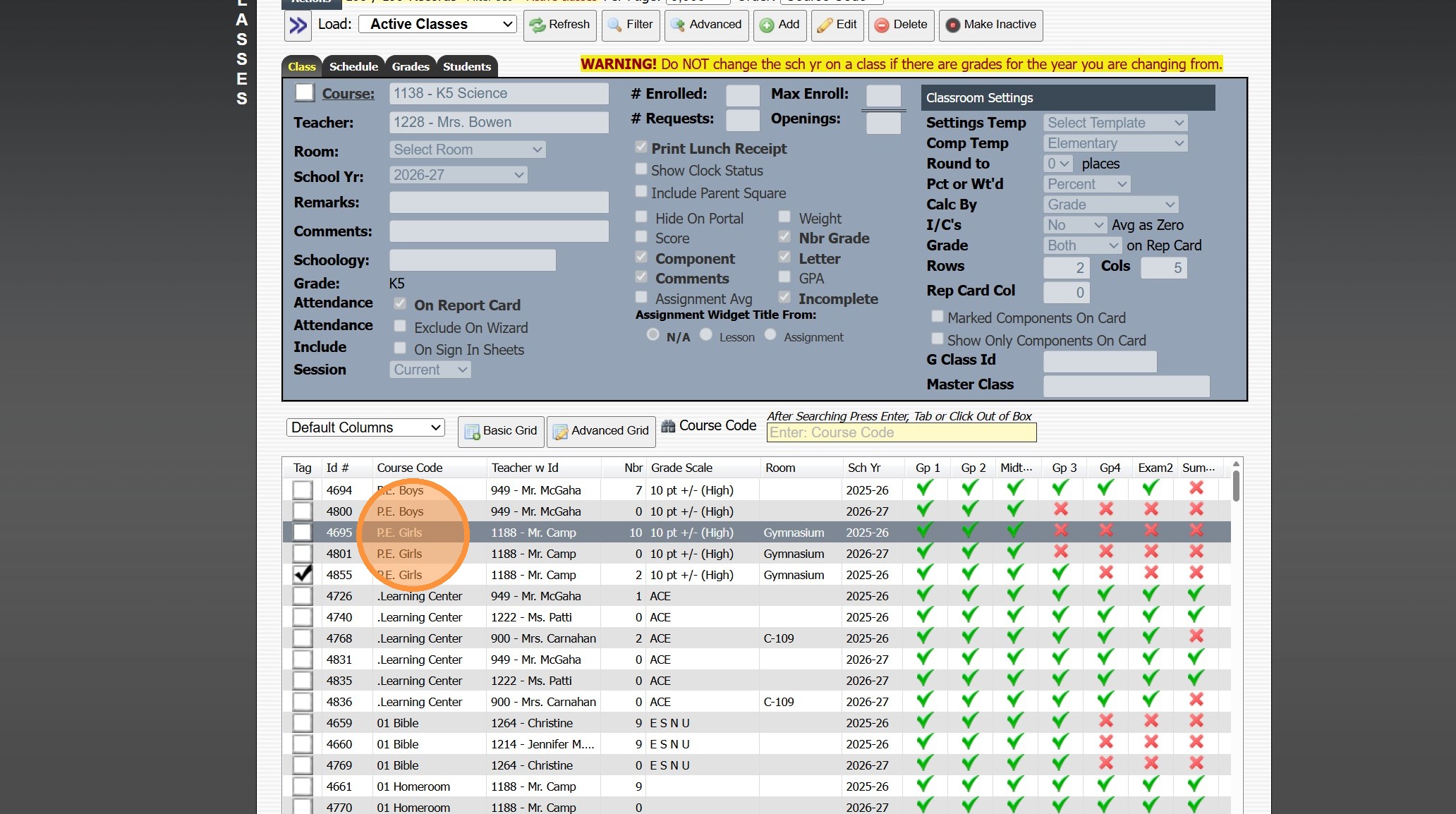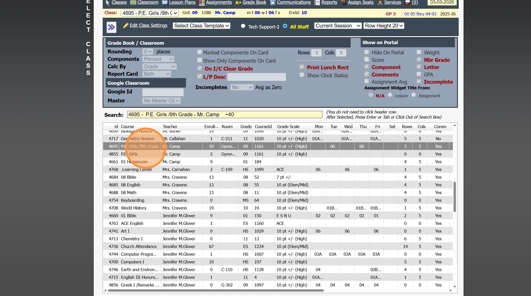 Viewing All Teacher's Classes