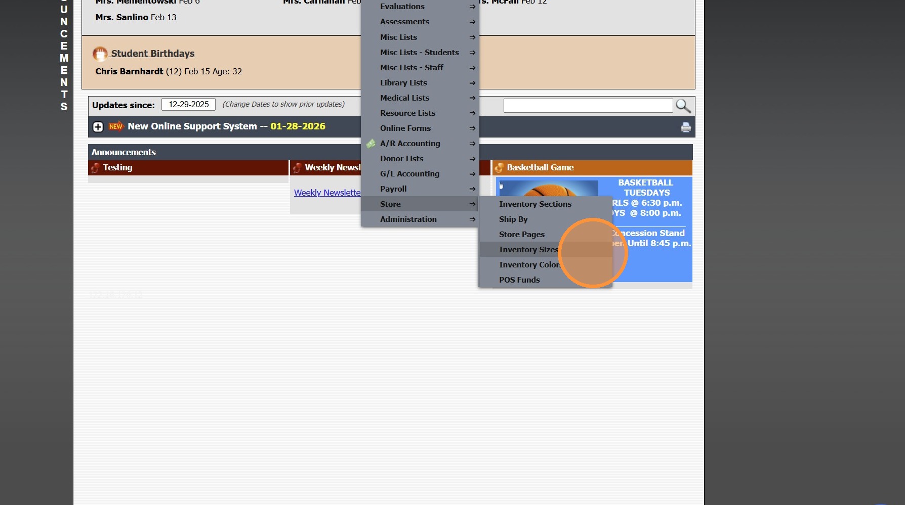 1. Click "Store" 2. Click "Inventory" 3. Click "Inventory" 4. Select Inventory Item 5. Click "Edit" for Sizes (Adding Store Item Sizes) 6. Select Sizes 7. Click "Save Changes" 8. Click "Edit" for Colors (Adding Store Inventory Item Colors) 9. Select ...