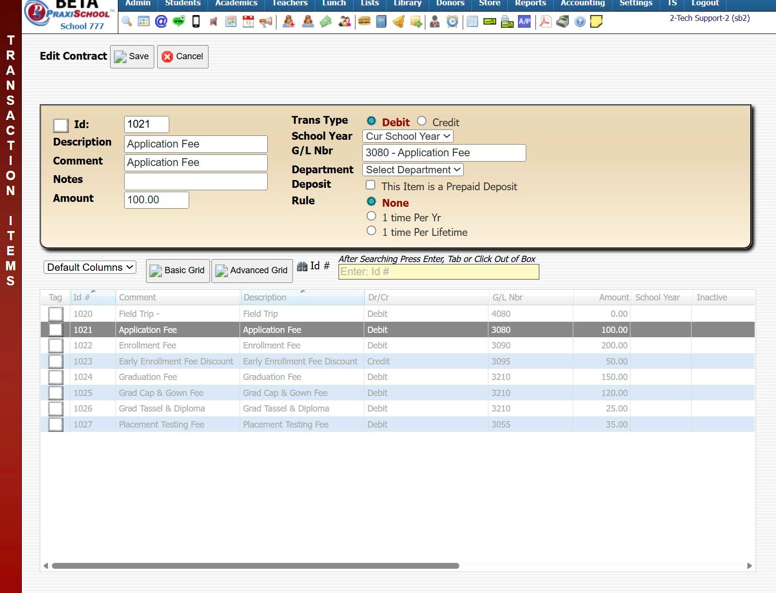 Adding a Transaction Item to a Student's AR Account Adding a Transaction Item to a Student's AR Account from Defined Items or Manually 1. Log into PraxiSchool 2. Click "Admin" 3. Click "Accounts Receivable" 4. Select Billing Account 5. Click $ to Add ...