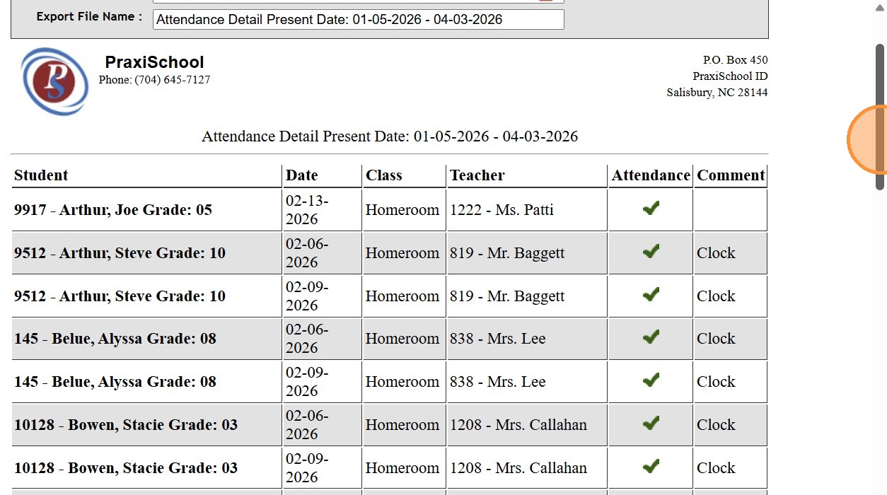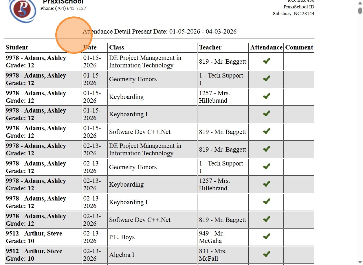 (Attendance Report Shows each Student Marked for the Selected Attendance Type)