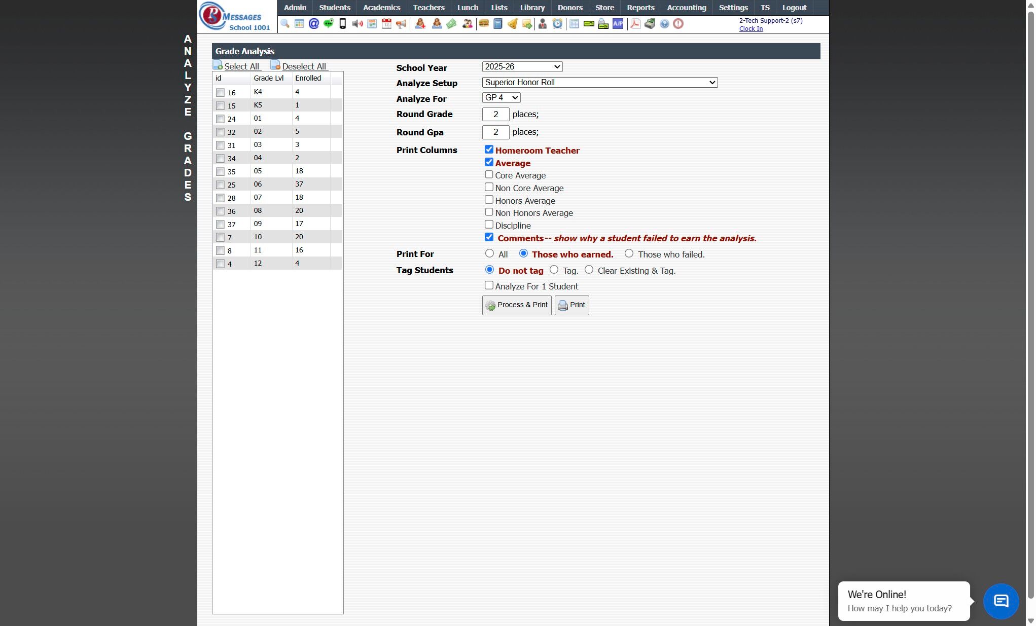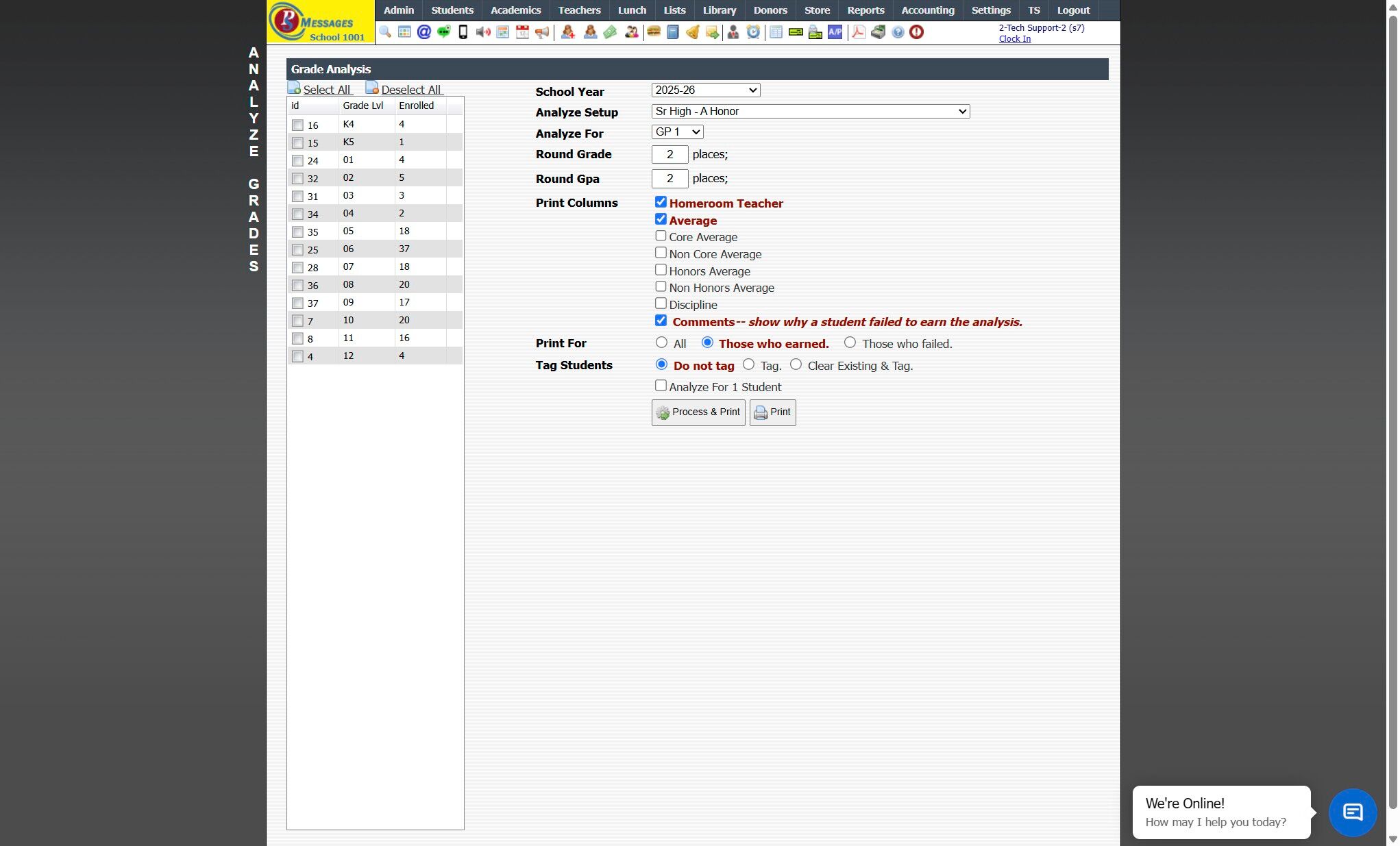 12. Grade Analysis Report Options: