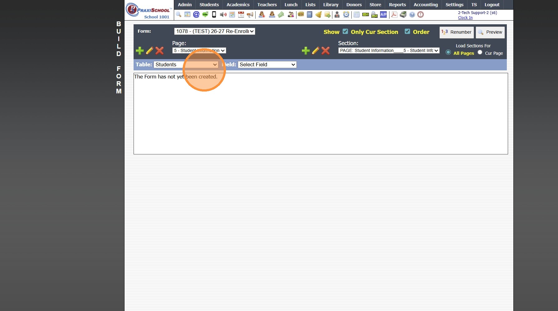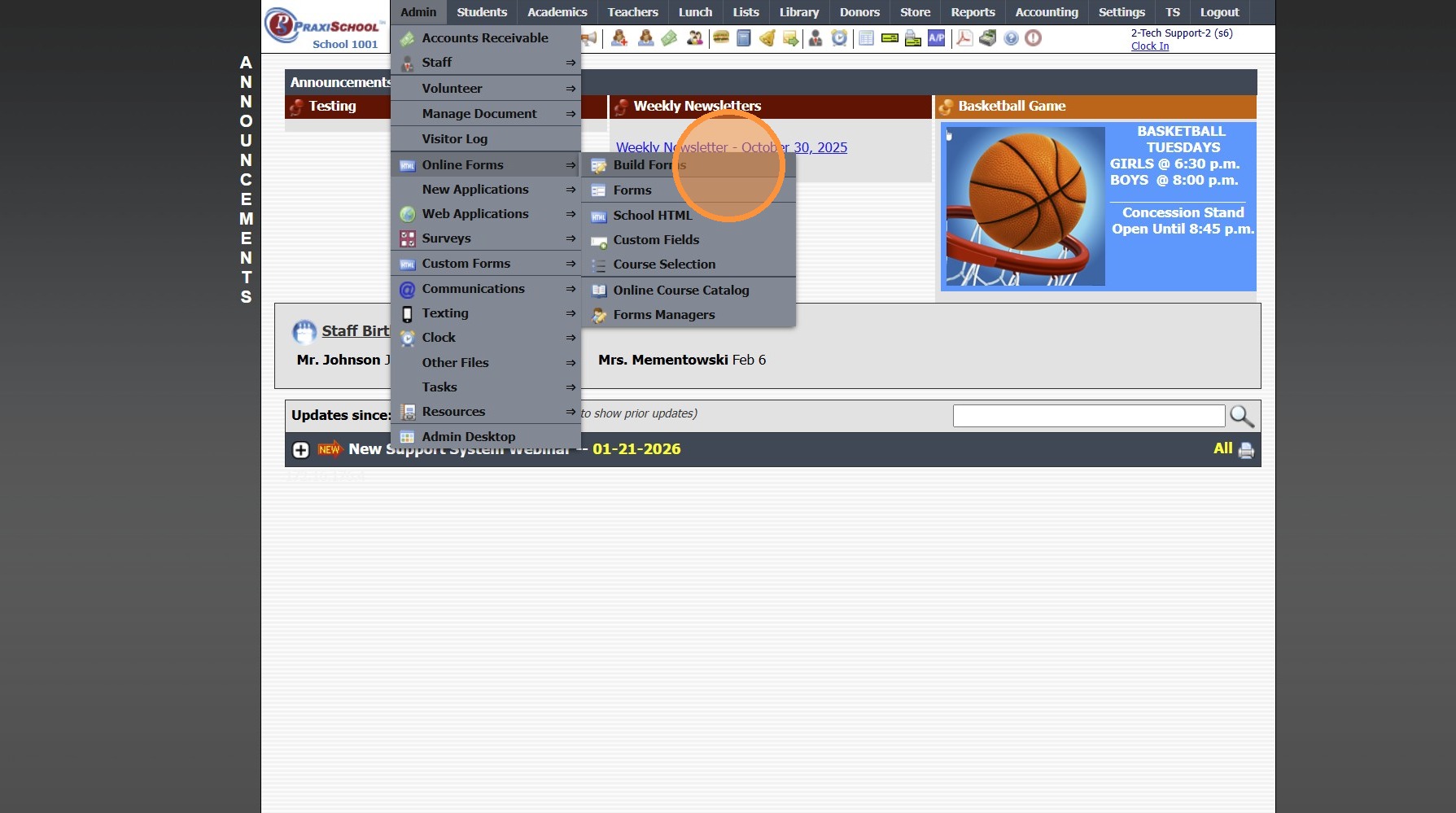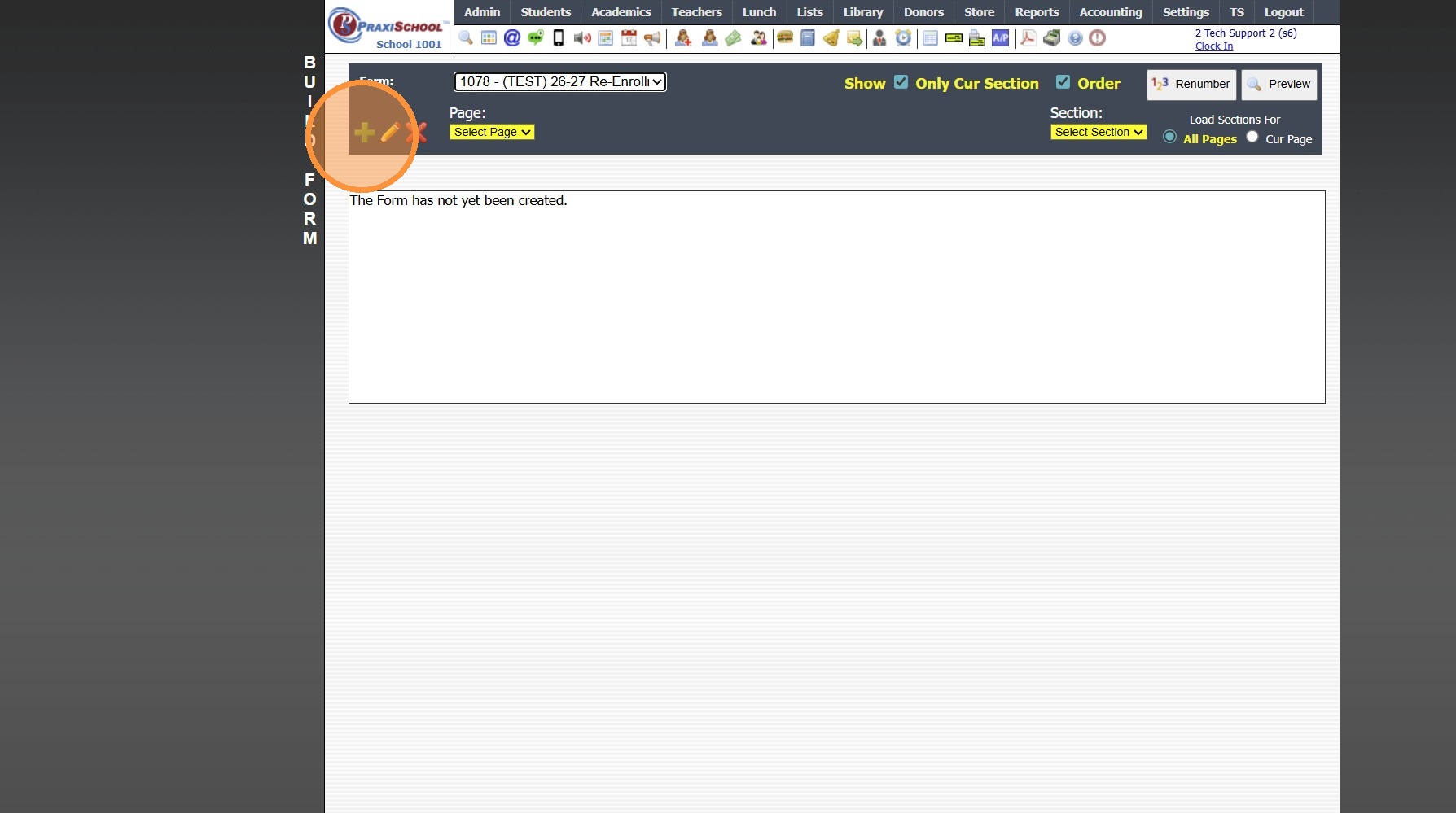 1. Click "Admin" 2. Click "Online Forms" 3. Click "Forms" 4. Click "Add" 5. Add Form Name, Description and Portal Form Name 6. Select the For Portal Option: "Parent - A/R Portal" 7. Click "Test" to put in Test Mode until Form is Built 8. Select ...