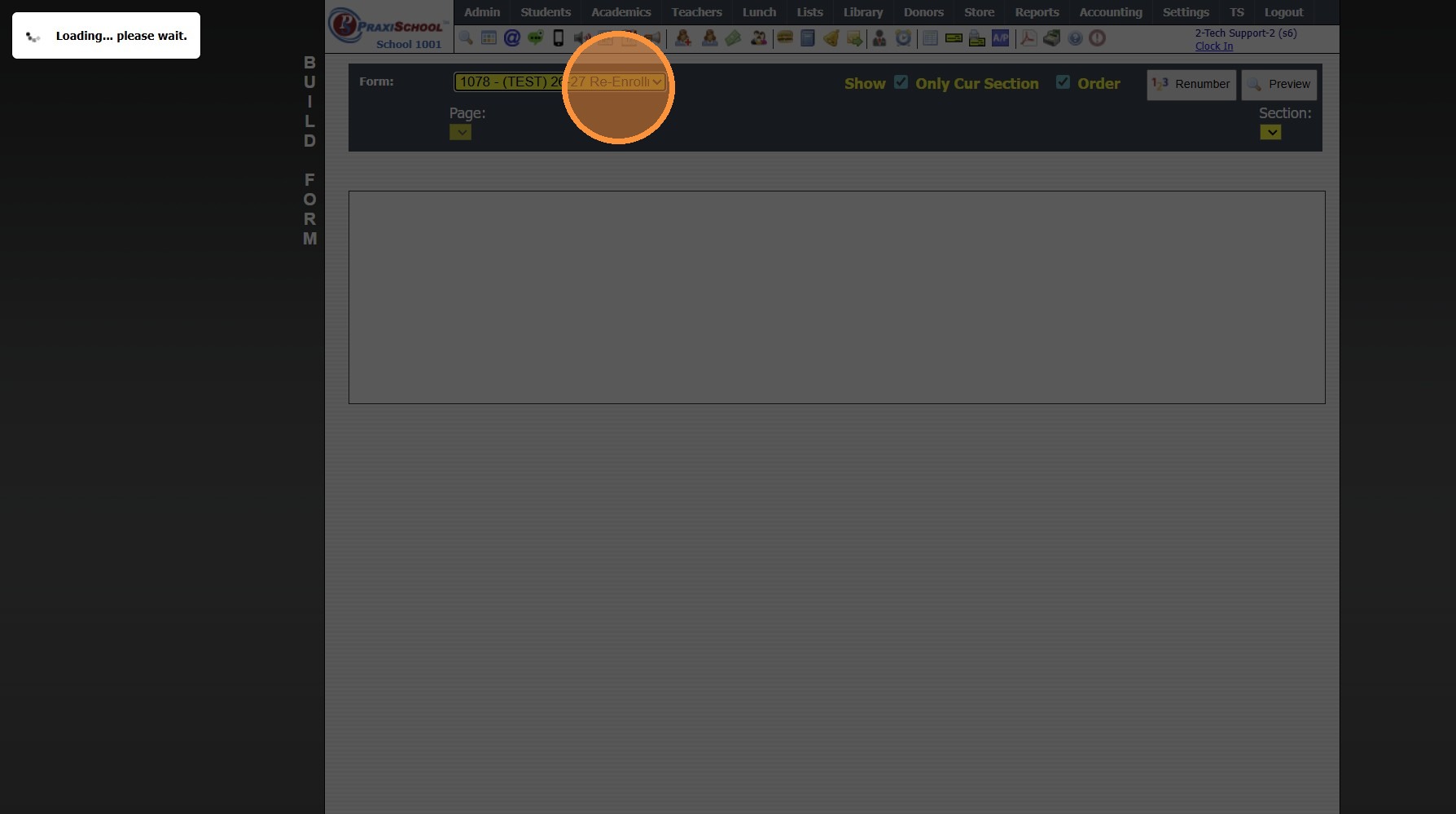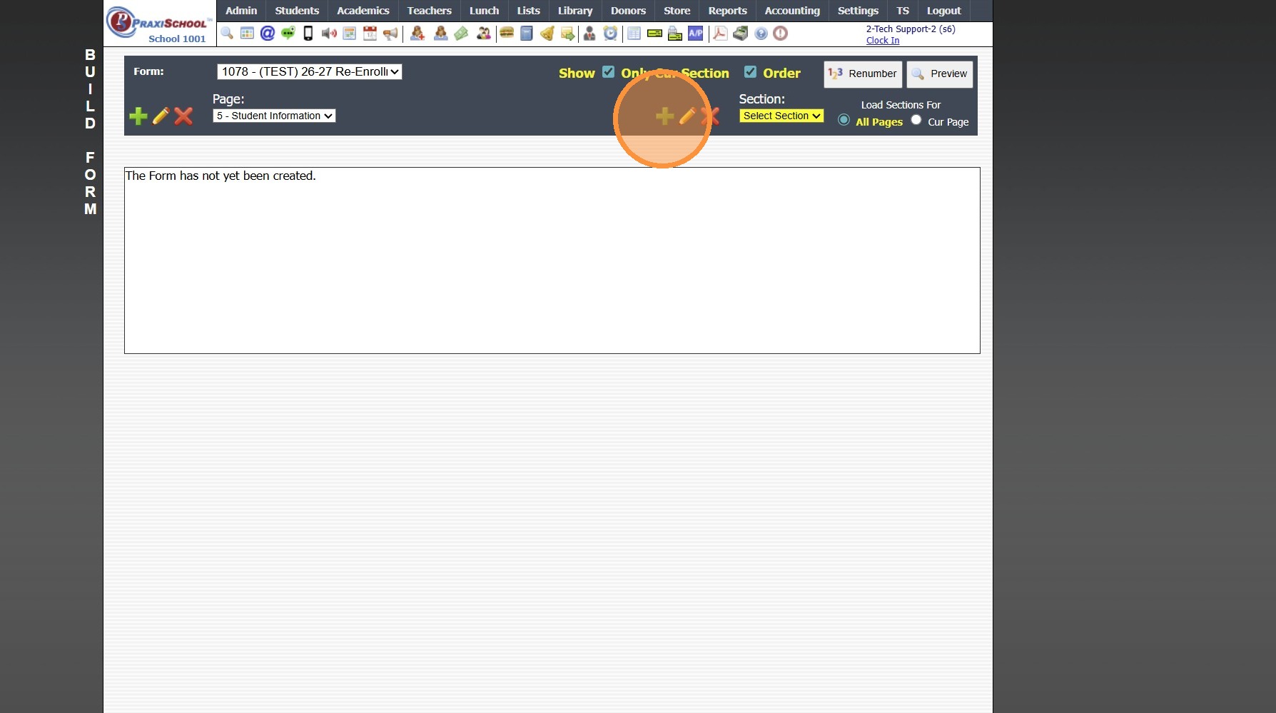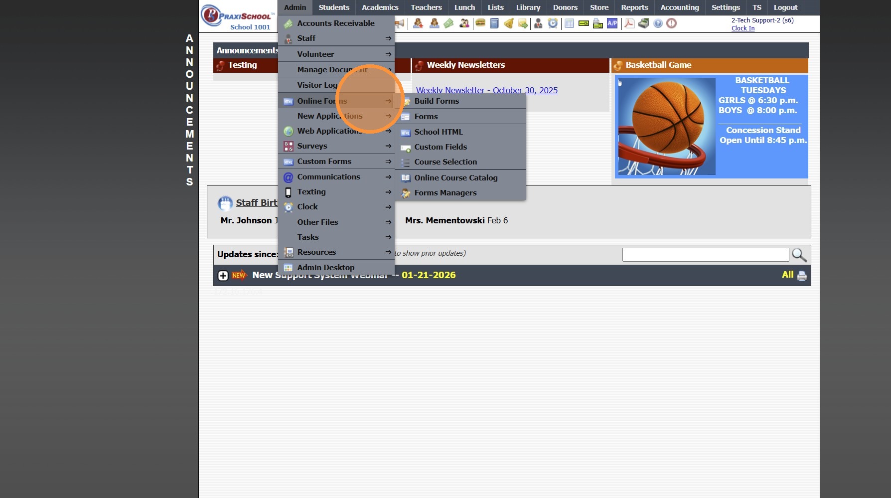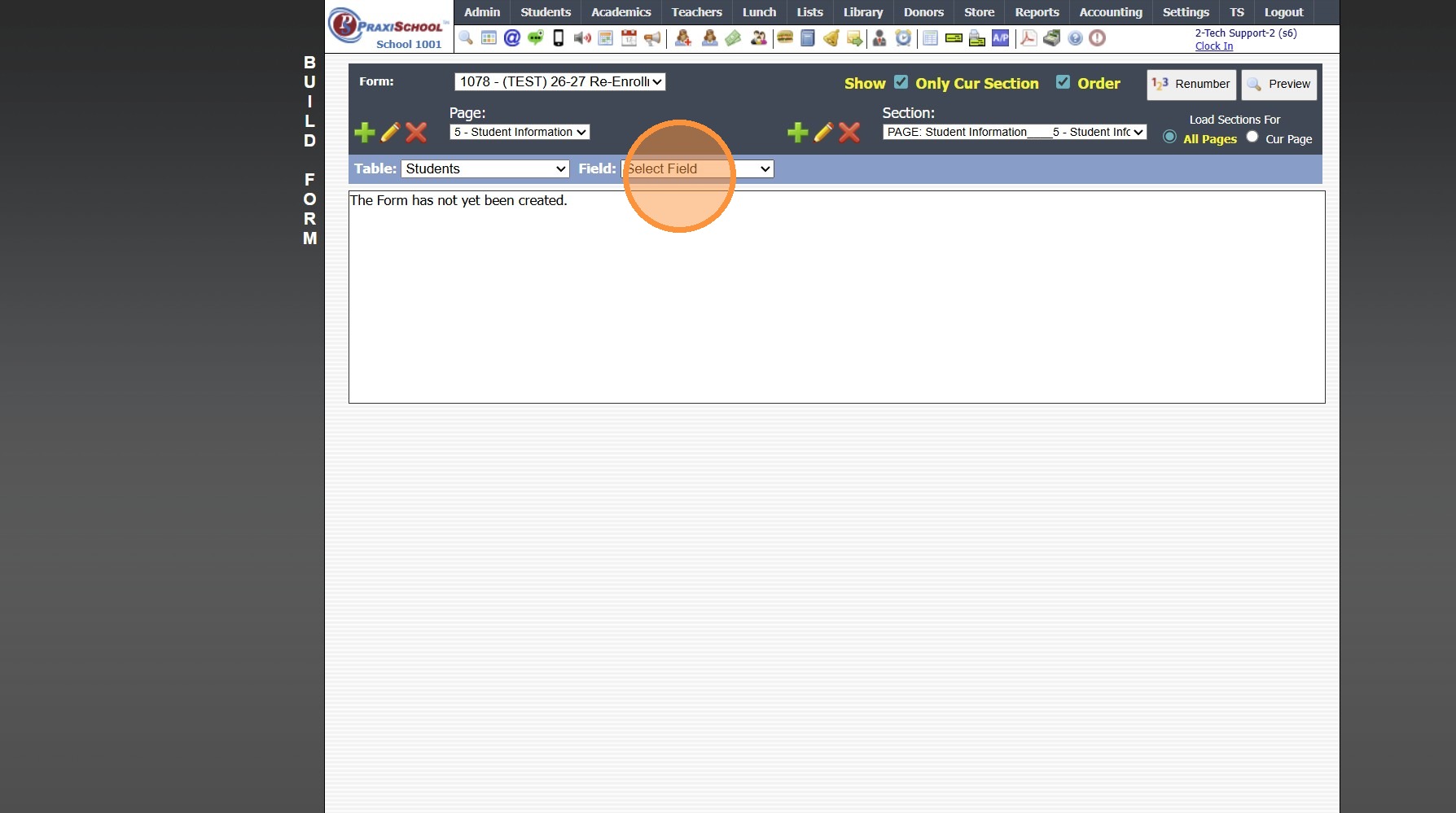 1. Click "Admin" 2. Click "Online Forms" 3. Click "Forms" 4. Click "Add" 5. Add Form Name, Description and Portal Form Name 6. Select the For Portal Option: "Parent - A/R Portal" 7. Click "Test" to put in Test Mode until Form is Built 8. Select ...