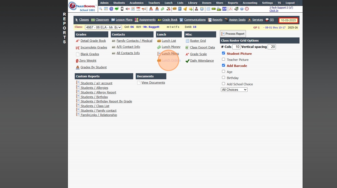 View Lunch Orders From Classroom 1. Log into PraxiSchool 2. Click "Teachers" 3. Click "Classroom" 4. Select Class 5. Click "Classroom" 6. Click the "Lunch" Toggle 7. Left Click on Student 8. Click "View Order" to View Selected Students Lunch Order 9. ...
