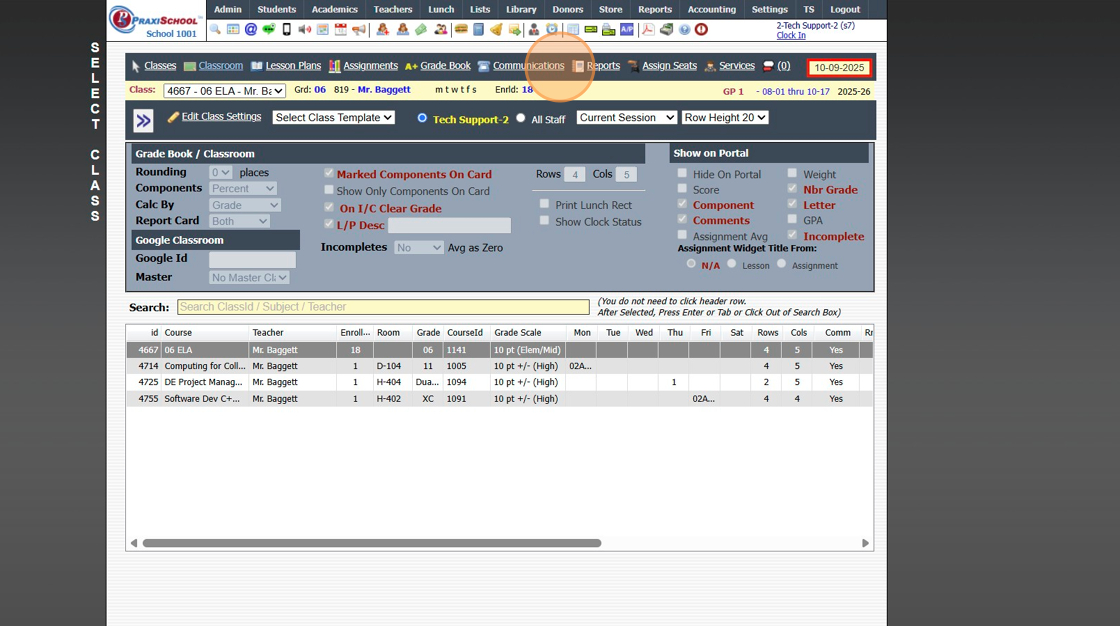 Classroom Detail Grades Report 1. Log into PraxiSchool 2. Click "Teachers" 3. Click "Classroom" 4. Select Class 5. Click "Reports" 6. Click "Detail Grade Book" (Detail Grade Book Report shows All Student's Assignment Grades for Class) 7. Click ...