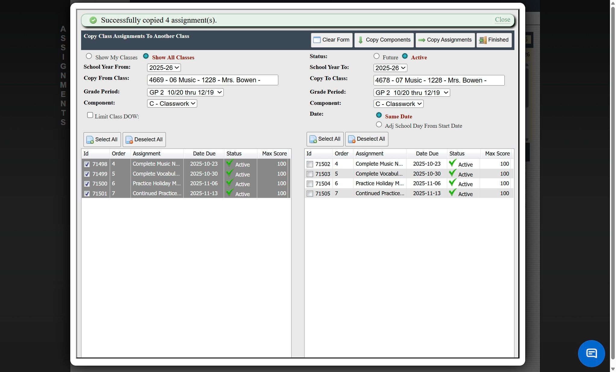 Copying Components 1. Log into PraxiSchool 2. Click "Teachers" 3. Click "Classroom" 4. Select Class 5. Click "Assignments" 6. Click "Copy Components" 7. Select Class to Copy From 8. Select Grade Period to Copy From 9. Click "Save" 2500.1.25