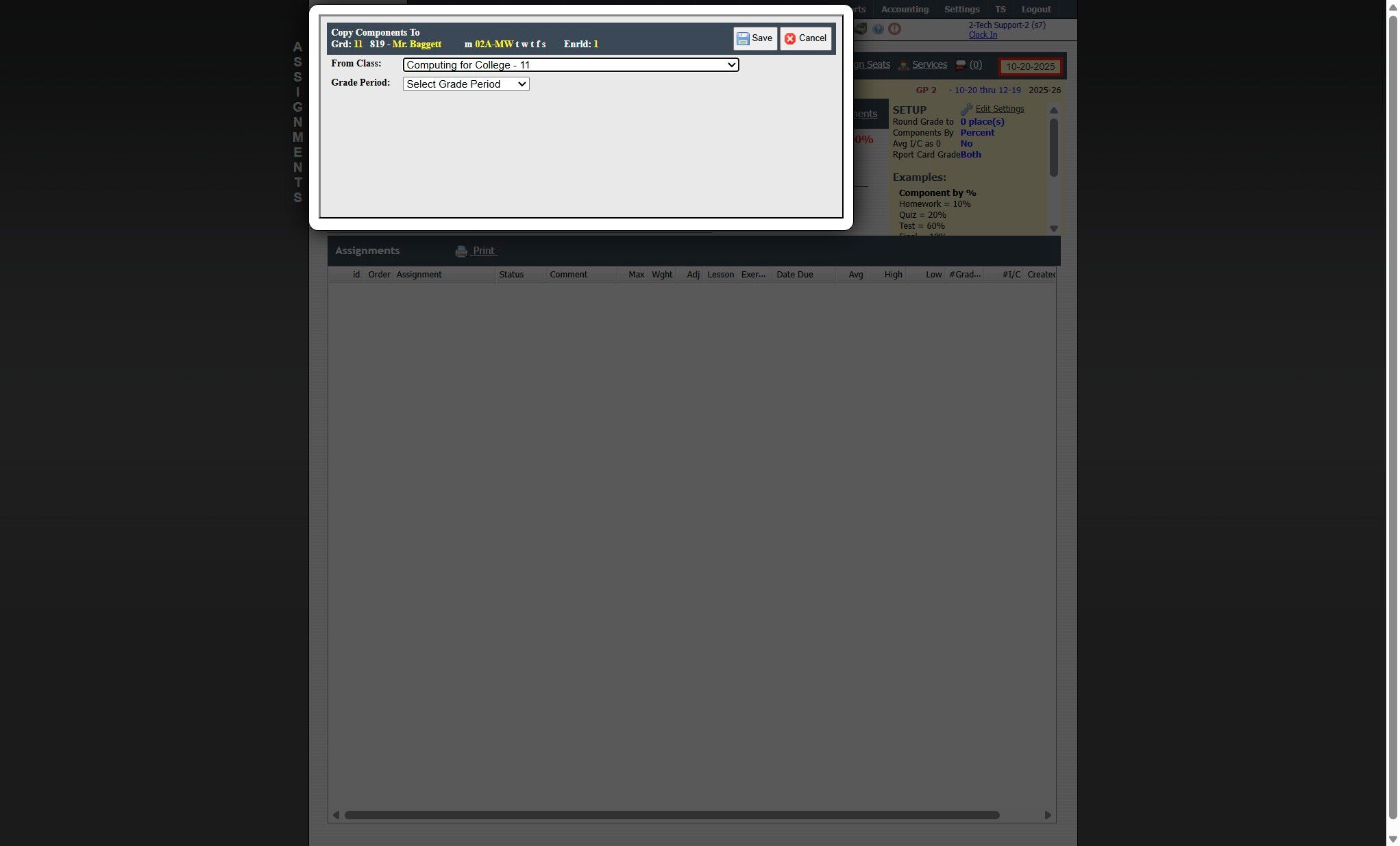 Copying Class Assignments from One Class to Another Class 1. Click "Teachers" 2. Click "Classroom" 3. Select Class 4. Click "Assignments" 5. Click "Copy Class Assignments" 6. Select School Year & Class to Copy From 7. Select Grade Period to Copy From ...