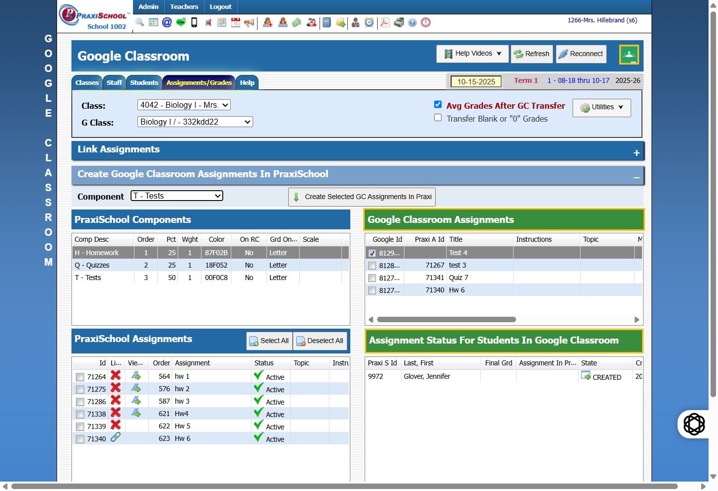 Transfer Grades From Google Classroom to PraxiSchool Class 1. Click "Teachers" 2. Click "Google Classroom" 3. Click "Assignments/Grades" 4. Select PraxiSchool Class 5. Check the Google Classroom Assignments the need to have grades transferred. Tip: ...