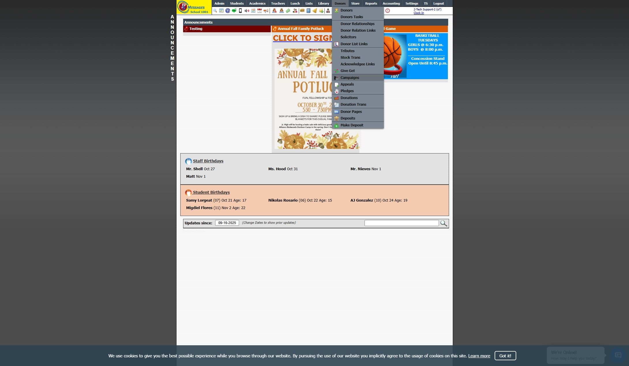 Creating a Donor Appeal 1. Log into PraxiSchool 2. Click "Donors" 3. Click "Appeals" 4. Click "Add" 5. Enter Appeal Description 6. Enter Start / End Dates 7. Select the Campaign 8. Select Show On Portal Order & Enter Notes (Optional) 9. Click this ...