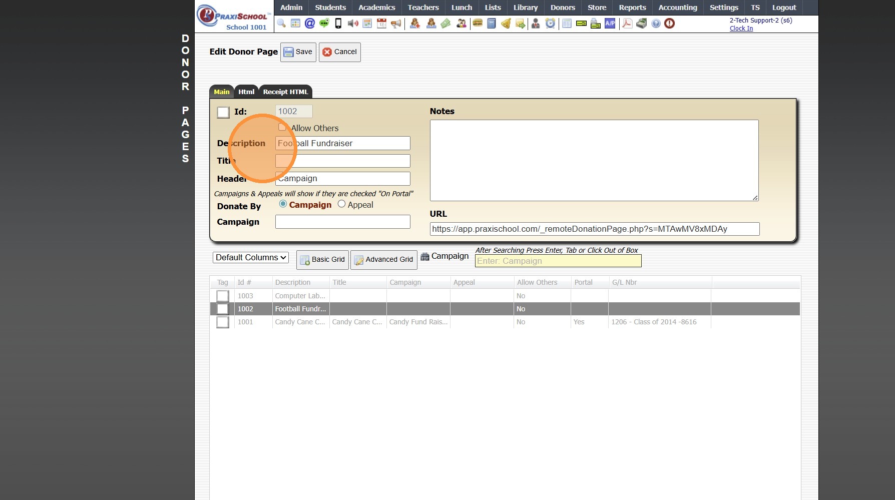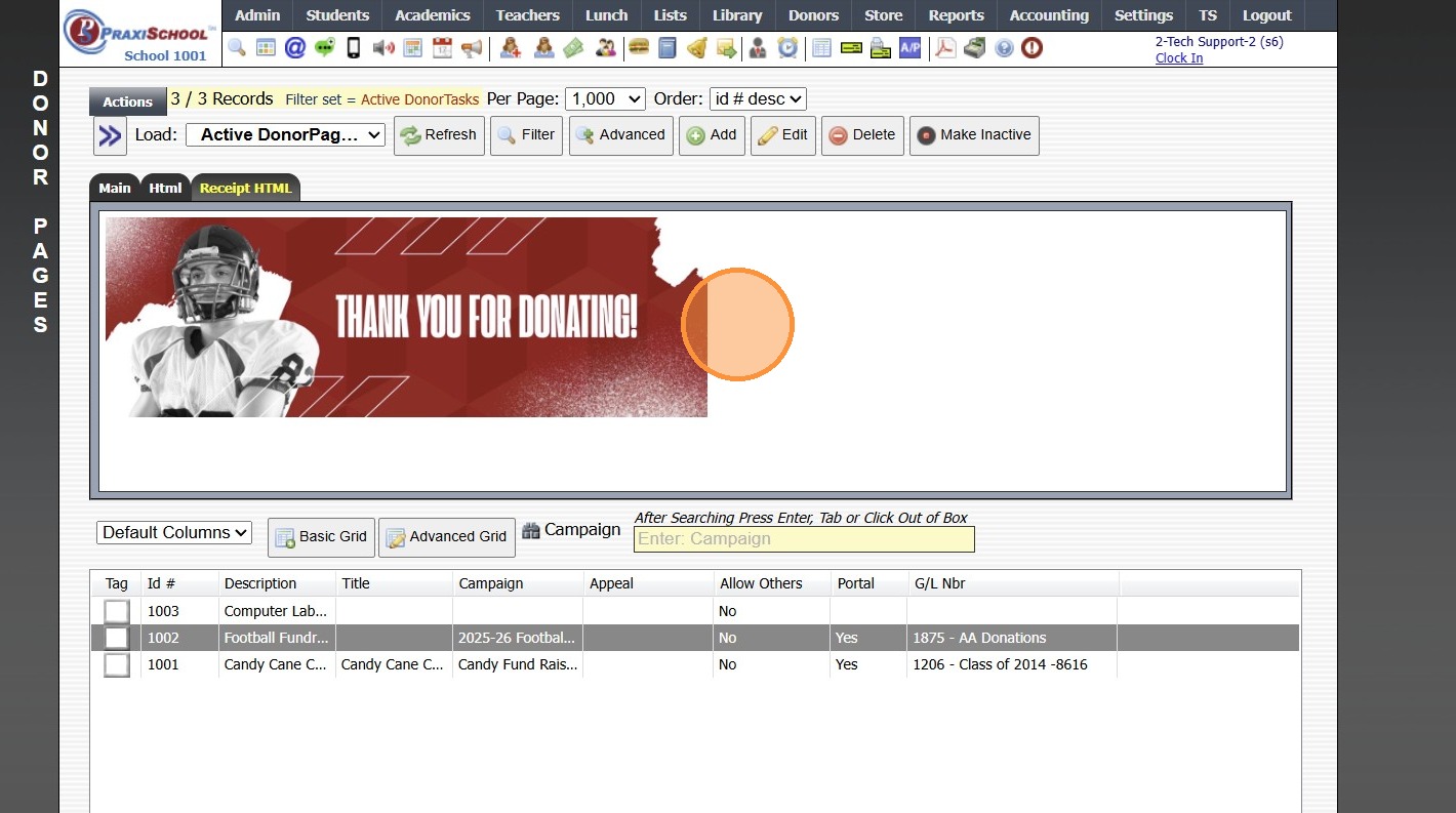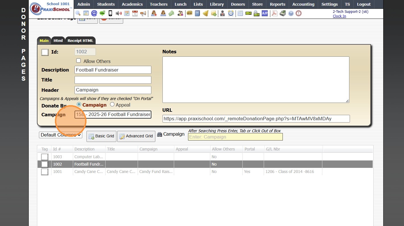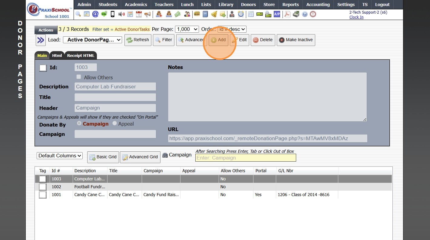 Creating a Donor Campaign 1. Log into PraxiSchool 2. Click "Donors" 3. Click "Campaigns" 4. Click "Add" 5. Enter the Campaign ID Name & Portal Name (Optional) 6. Select the General Ledger Number. Department, Receivable General Ledger Number and Notes ...