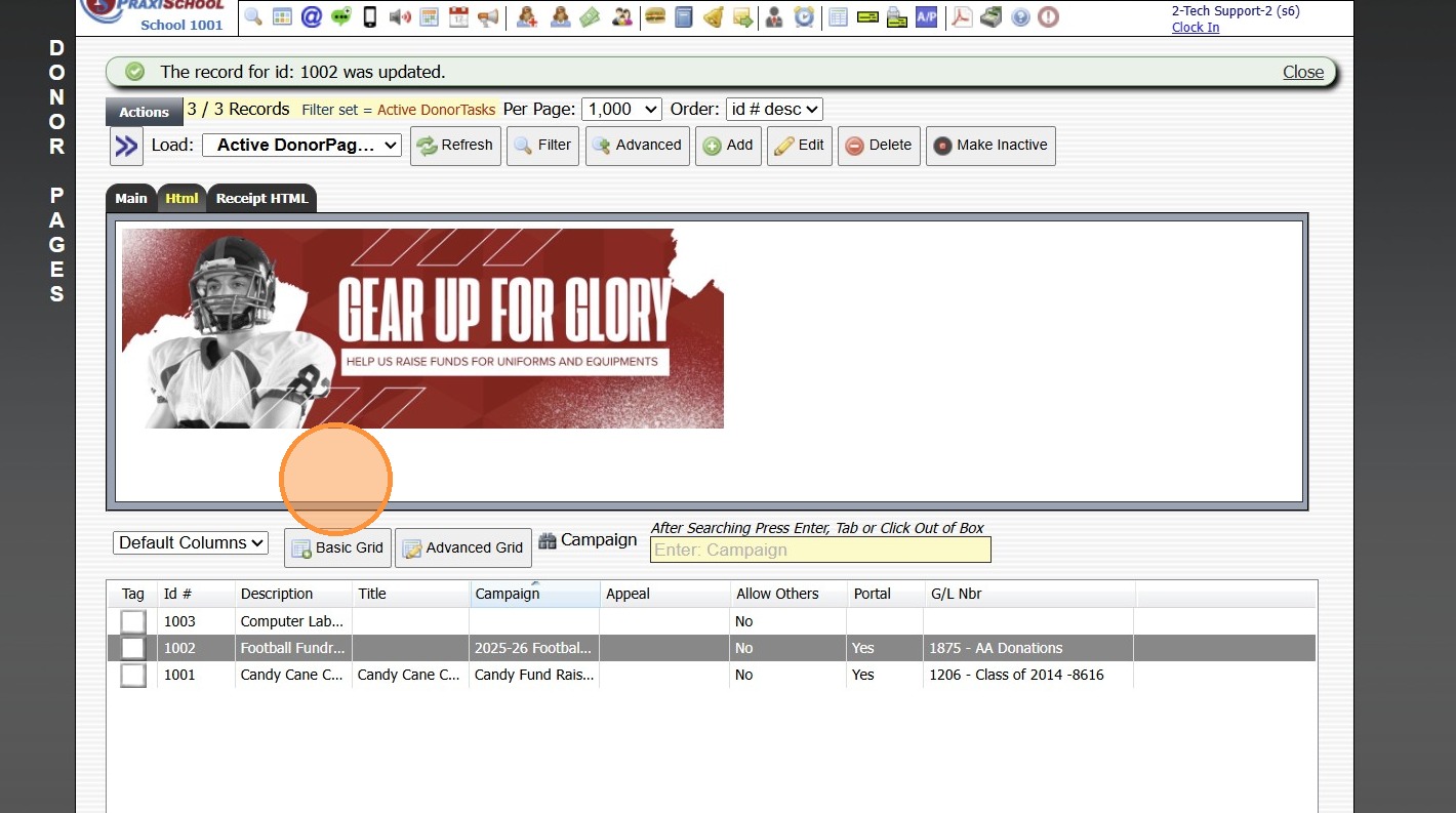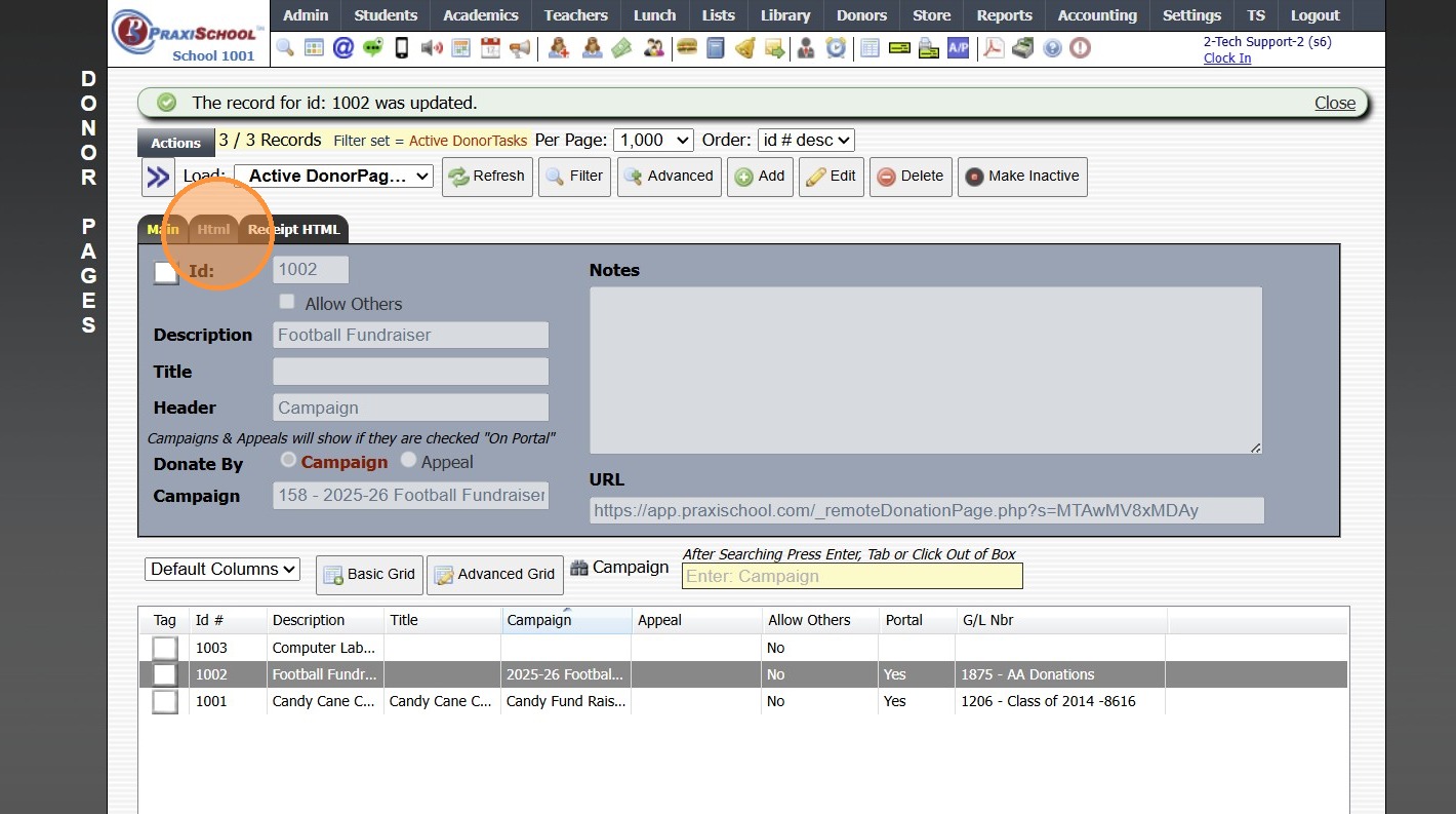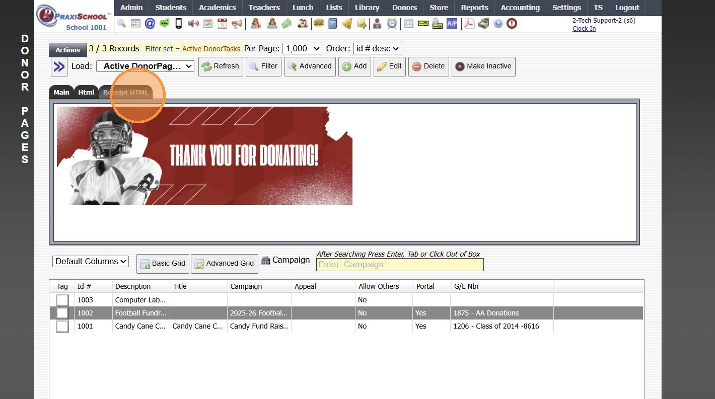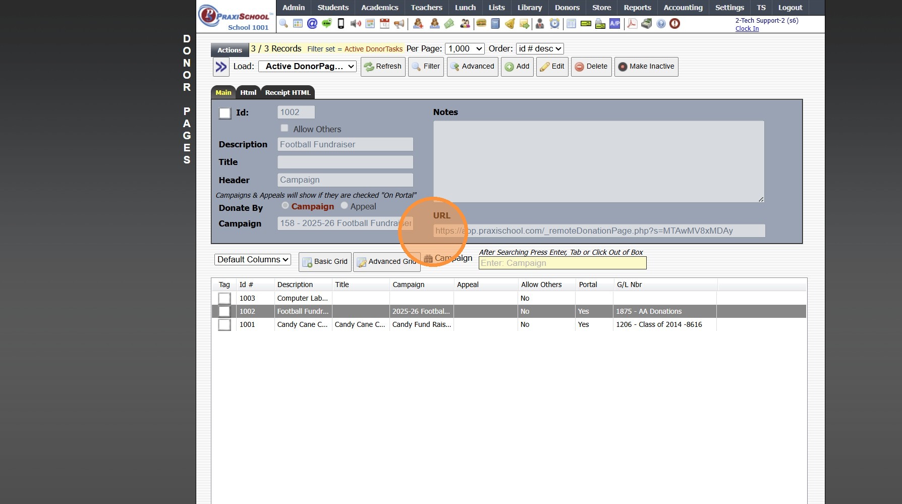 Creating a Donor Campaign 1. Log into PraxiSchool 2. Click "Donors" 3. Click "Campaigns" 4. Click "Add" 5. Enter the Campaign ID Name & Portal Name (Optional) 6. Select the General Ledger Number. Department, Receivable General Ledger Number and Notes ...