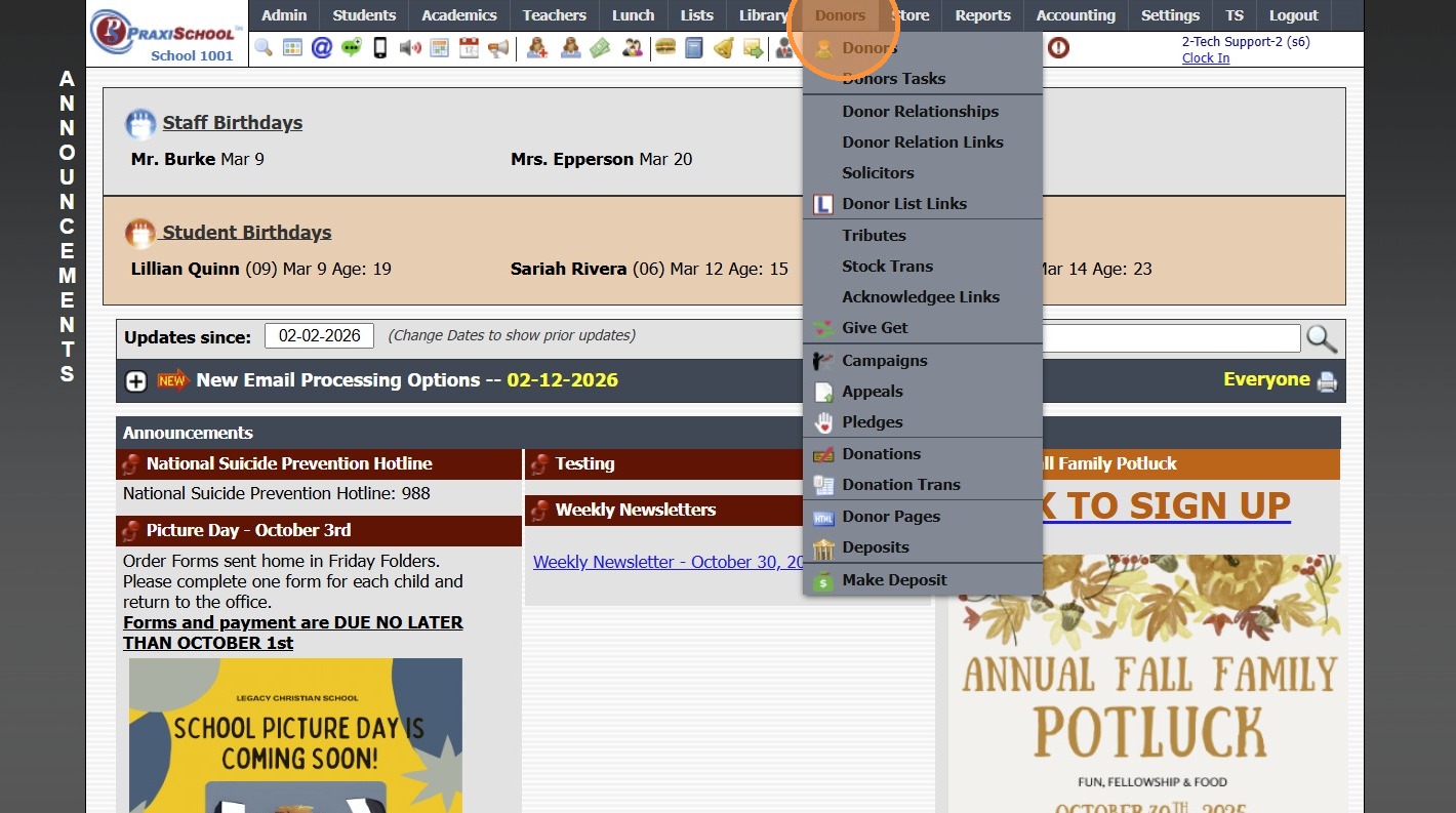 Creating a Donor Appeal 1. Log into PraxiSchool 2. Click "Donors" 3. Click "Appeals" 4. Click "Add" 5. Enter Appeal Description 6. Enter Start / End Dates 7. Select the Campaign 8. Select Show On Portal Order & Enter Notes (Optional) 9. Click this ...