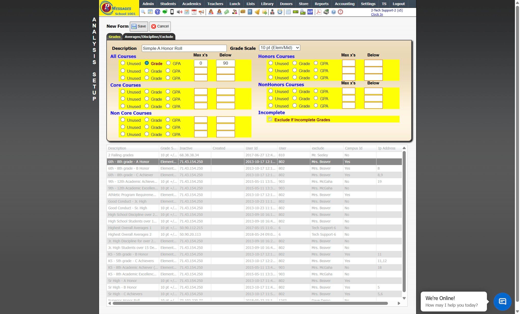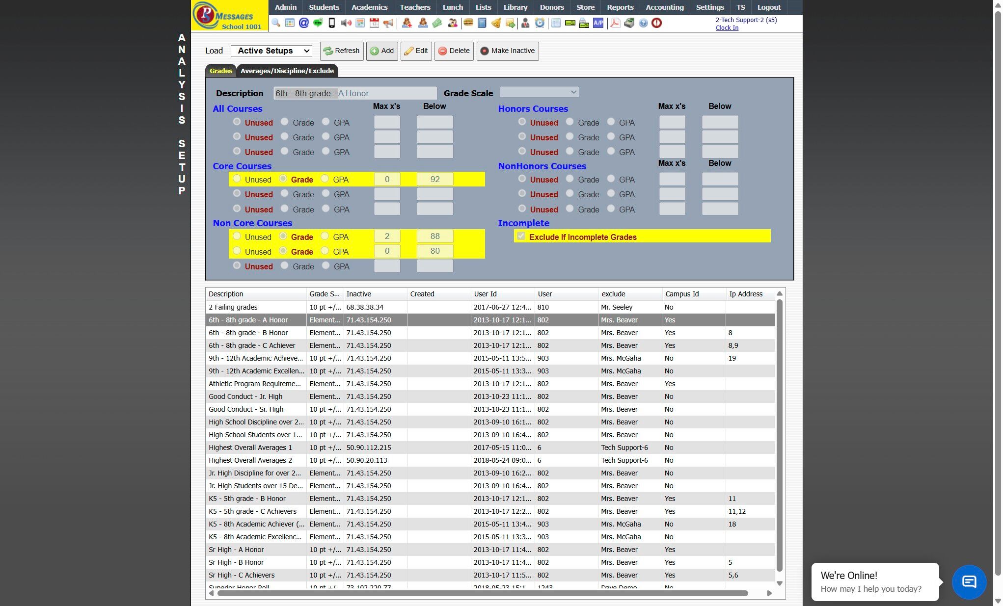 Creating a Grade Analysis Creating a Simple Grade Analysis for All Classes on the same Grade Scale 1. Click "Academics" 2. Click "Grades Setup" 3. Click "Analysis Setup" 4. Click "Add" 5. Enter Grade Analysis Description Example: A Honor Roll 6. ...