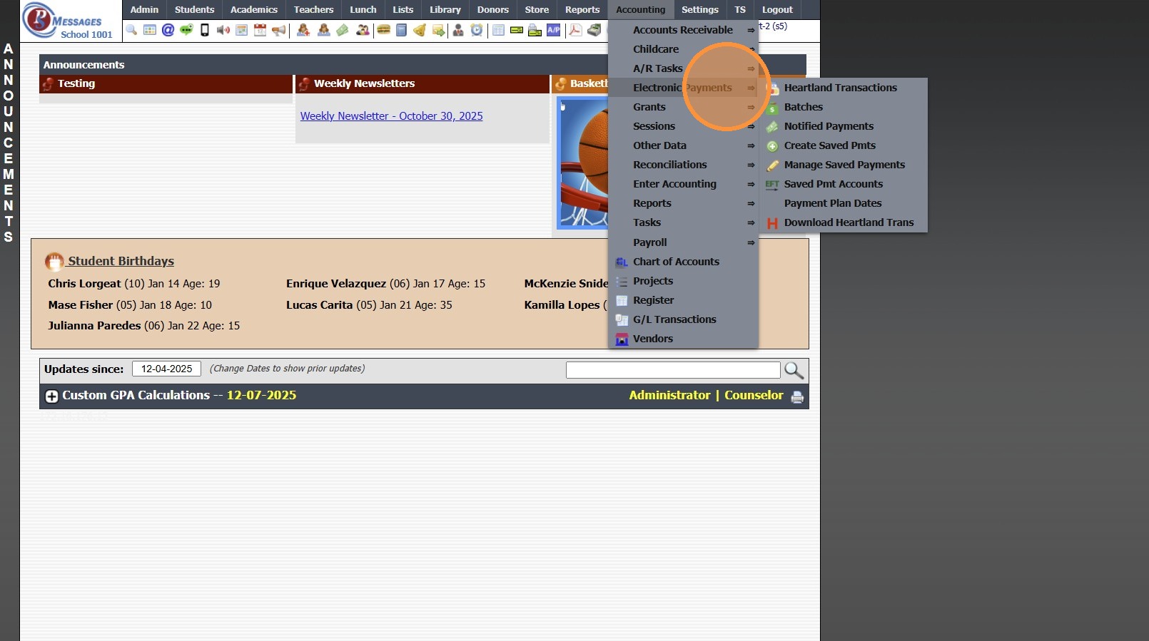 Posting a Payment to an Accounts Receivable (Parent Billing Account) 1. Log into PraxiSchool 2. Click "Admin" 3. Click "Accounts Receivable" 4. Select AR Account to Post Payment 5. Click the "$" Symbol 6. Select the Payment Type 7. Enter Payment ...