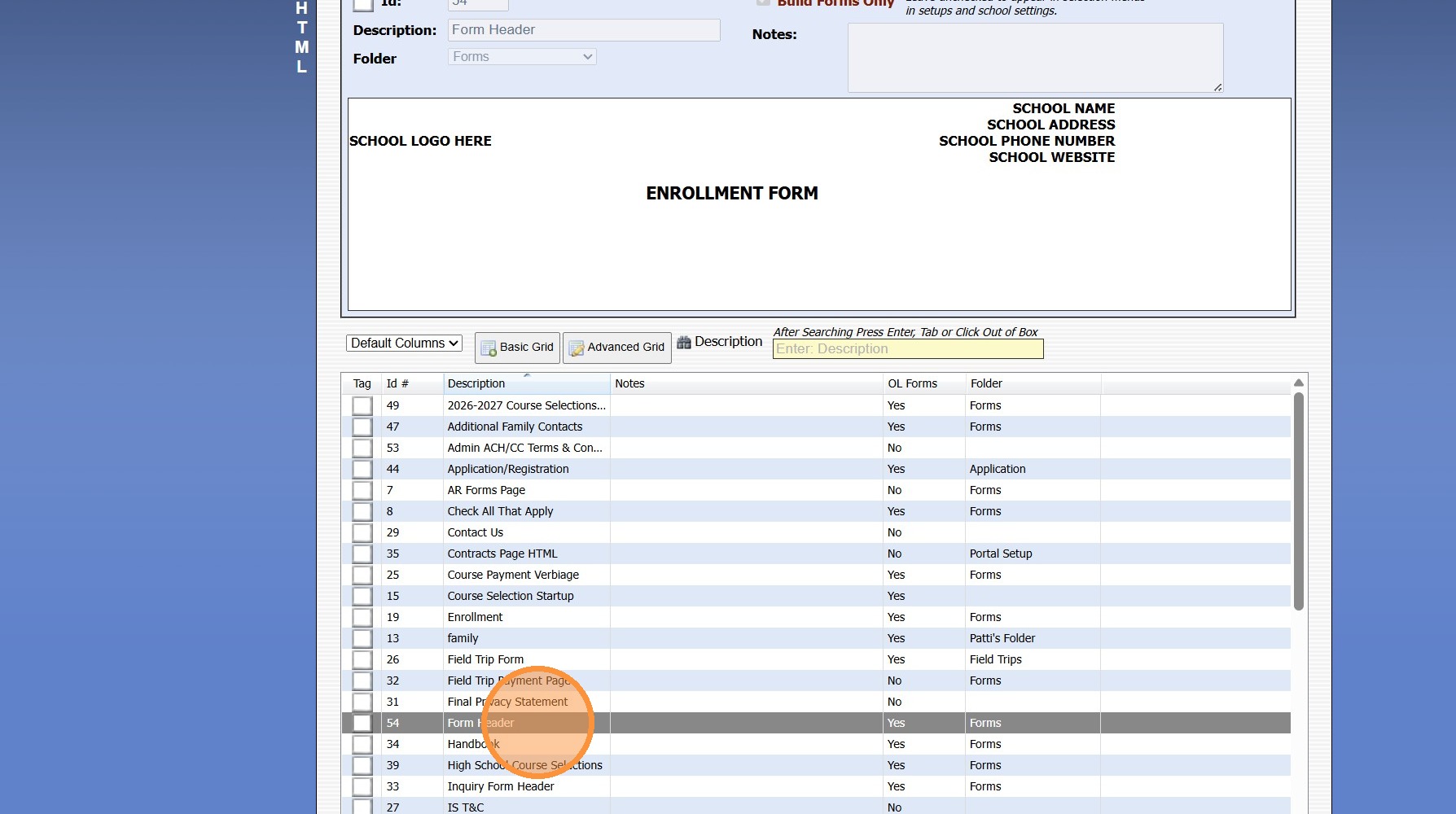 1. Click "Admin" 2. Click "Online Forms" 3. Click "School HTML" 4. Click "Add" 5. Enter Description 6. Select a Folder or Click the Blue Bar & Add a New Folder 7. Check the Build Forms Only Box (If this box is NOT checked, the HTML will not be ...