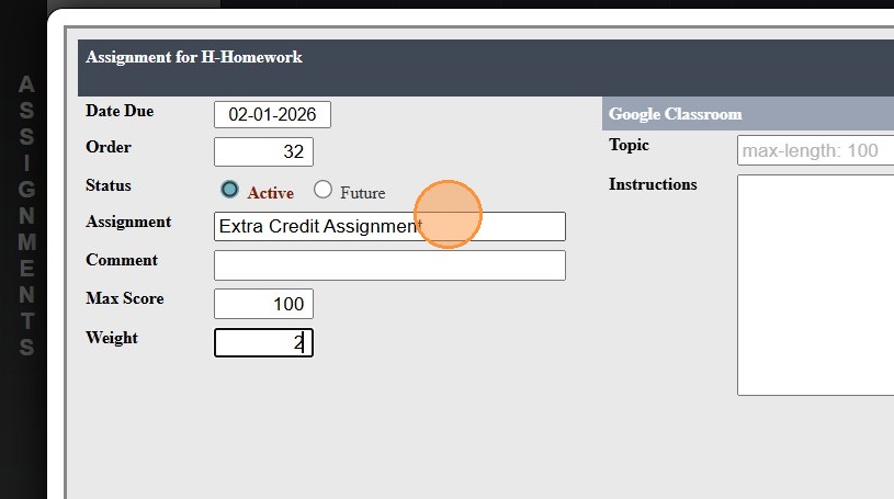 1. Click "Teachers" 2. Click "Classroom" 3. Select Class 4. Click "Grade Book" 5. Select "Post Grades" 6. Select the Component 7. Select the Assignment 8. Check the Override Box 9. Enter the Grade with the Extra Credit Points 10. A Comment can be ...