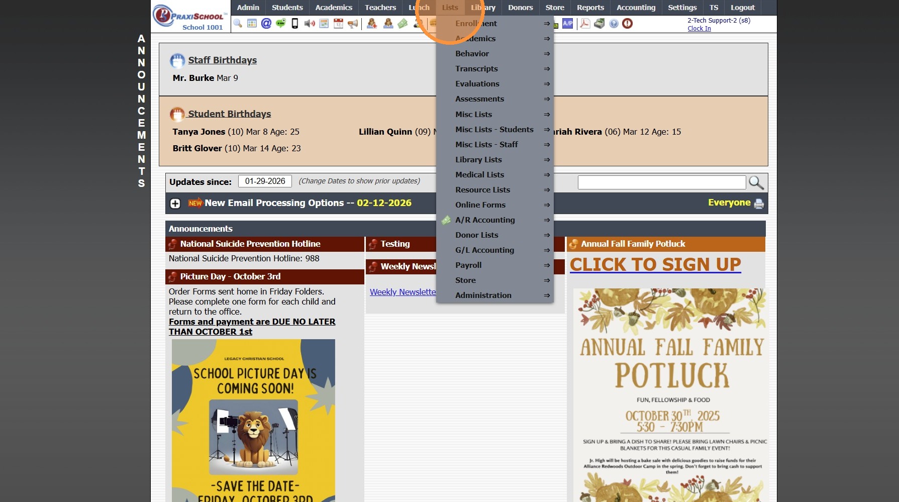 1. Click "Academics" 2. Click "Classes" 3. Click "Actions" 4. Click "Roll Forward" 5. Click "Select All" to Roll all Classes into the New Year 6. Select the New School Year 7. Click "Create New Classes" 2000.13.3