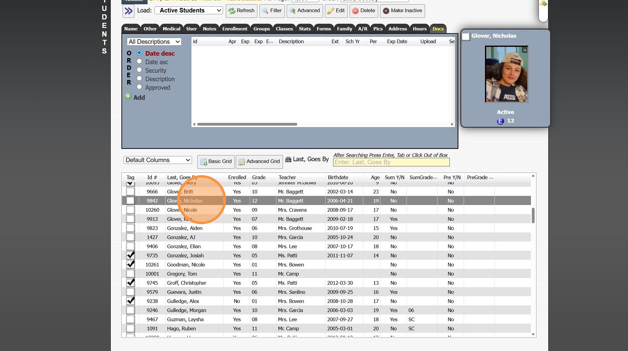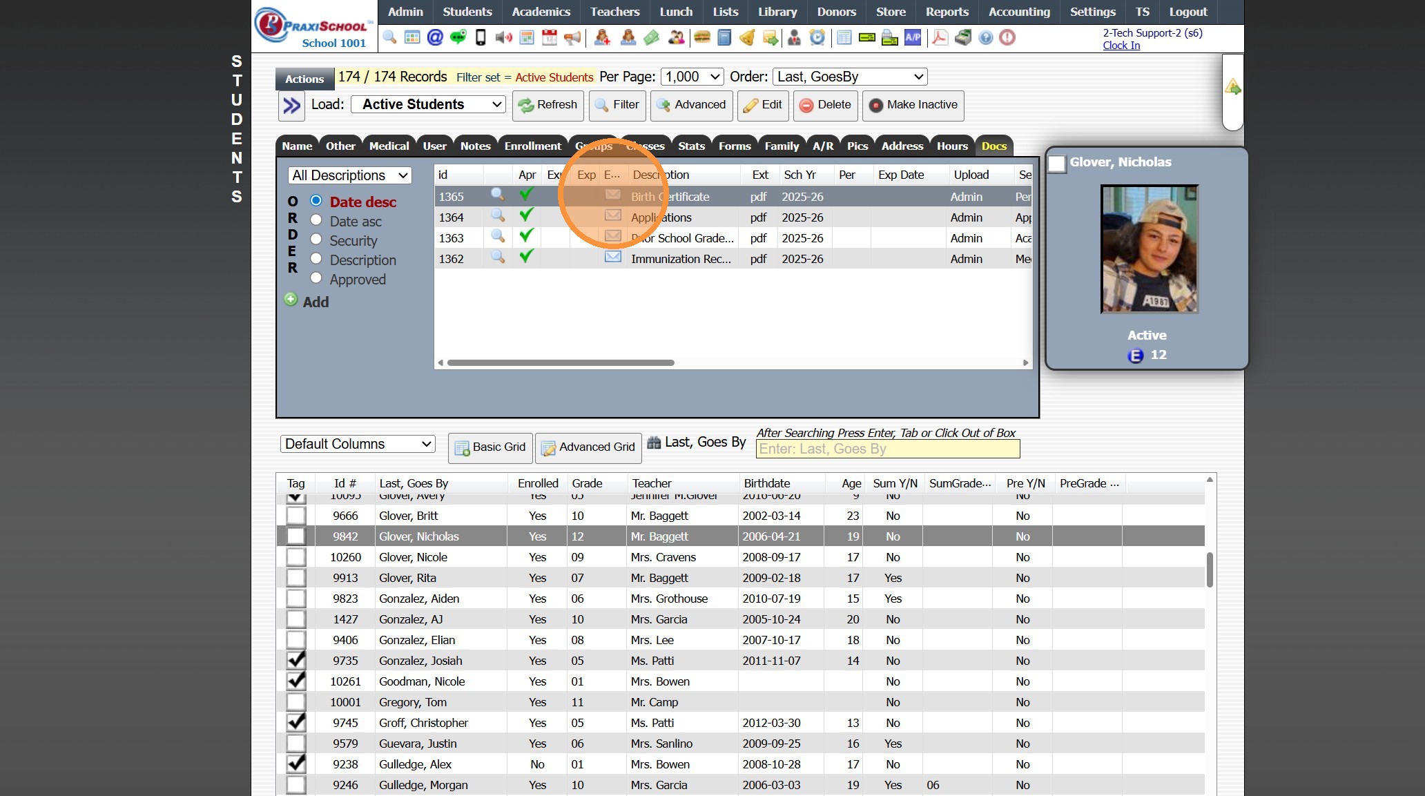 1. Click "Students" 2. Click "Students" 3. Select Student 4. Click the "Docs" Tab 5. Click "Add" 6. Select the Security, Folder & Description 7. Click "Choose File" 8. Verify School Year 9. Click "Upload Document" 1000.4.1.1