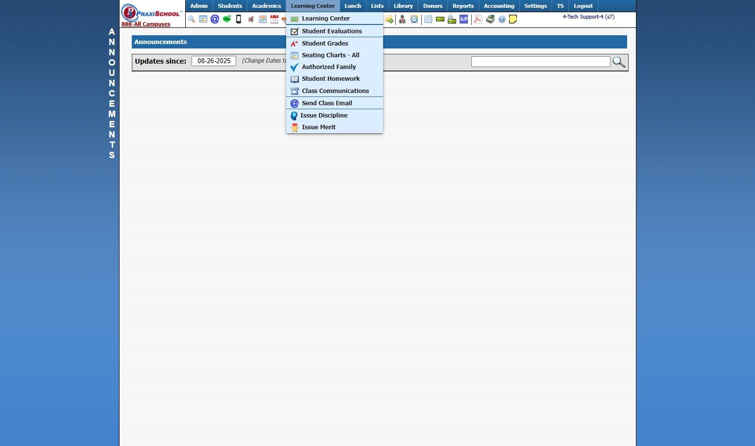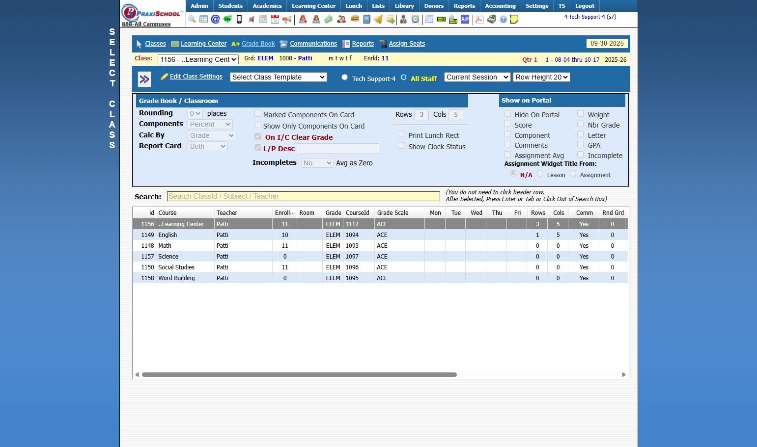 3. Select "Learning Center" Class and Click "Grade Book"