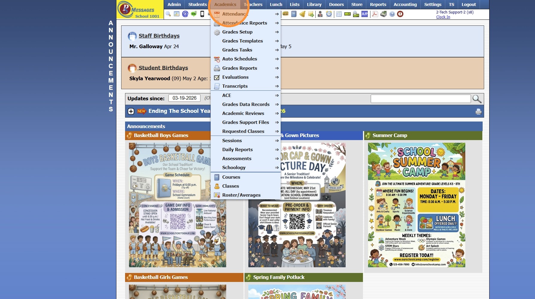 1. Click "Academics" 2. Click "Grades Tasks" 3. Click "Promote Students" 4. Select the Effective Date 5. Select Grade Levels to Promote 6. Click "Next Session" to Pre-Register for Next Year 7. Click "Create Record in Enrollment History" to add the ...