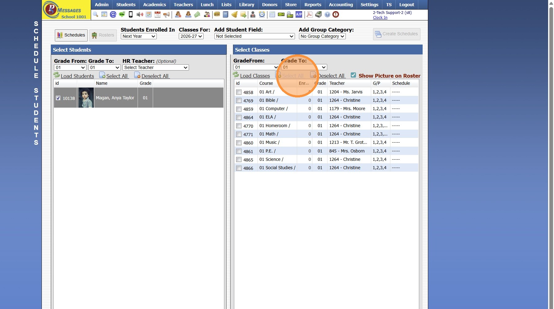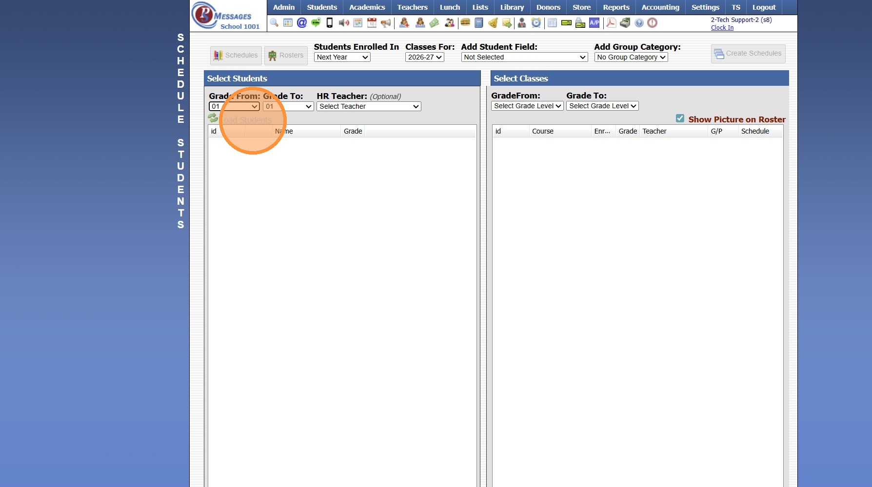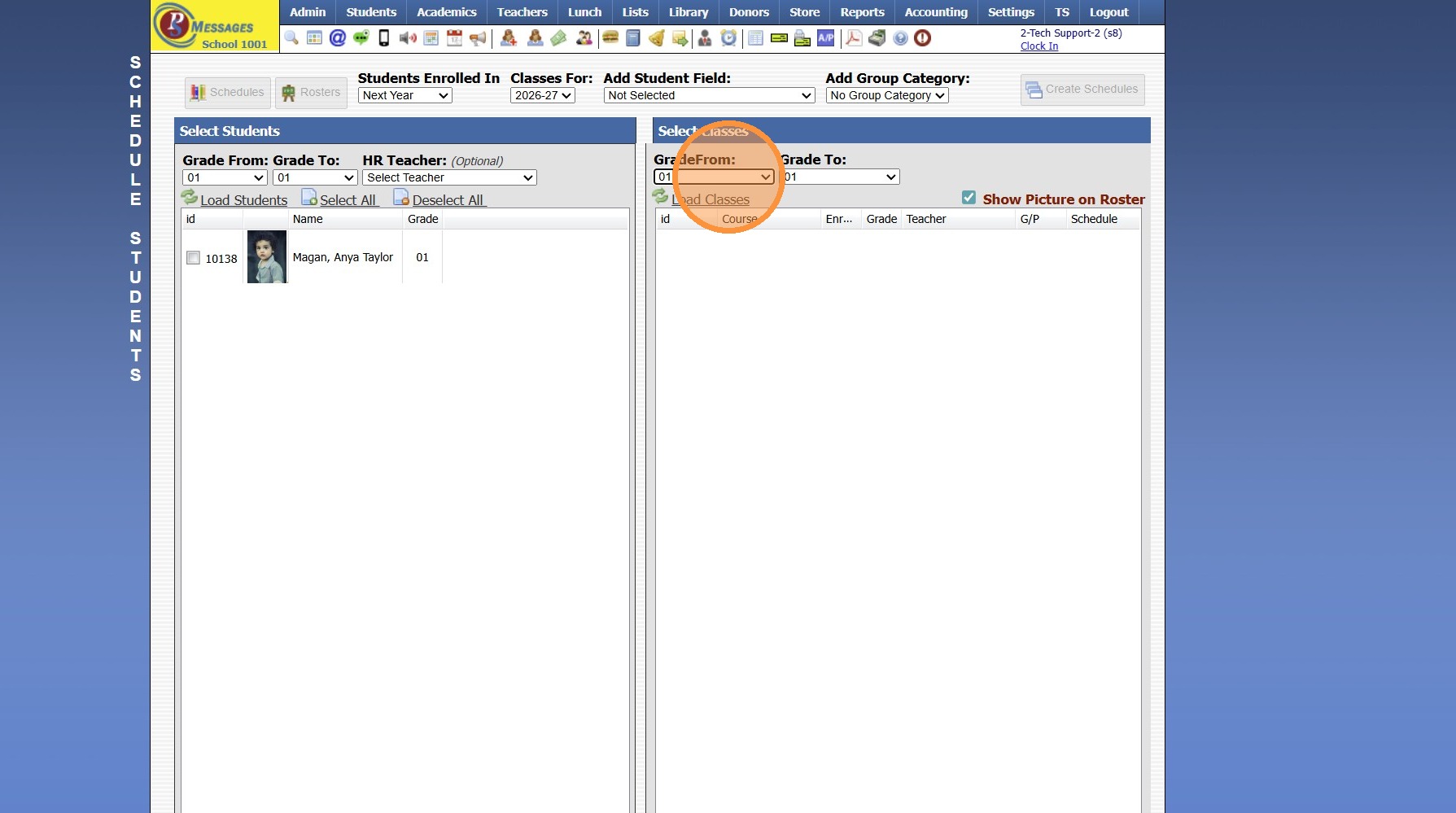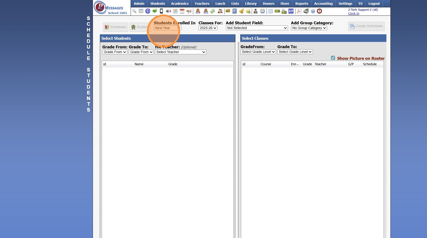 Scheduling Students into Classes by Grade Level 1. Log into PraxiSchool 2. Click "Academics" 3. Click "Grades Tasks" 4. Click "Schedule Students" 5. Current Year is the Default Option for Students Enrolled In (Select Summer or Next Year if scheduling ...