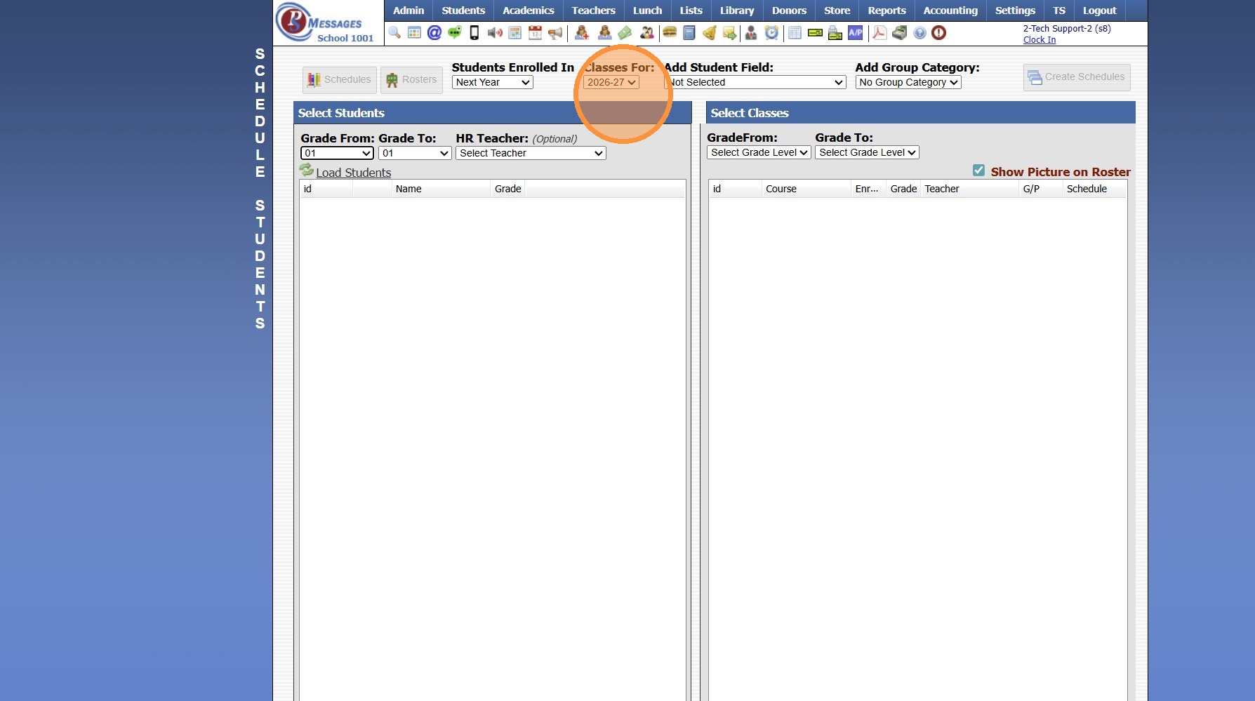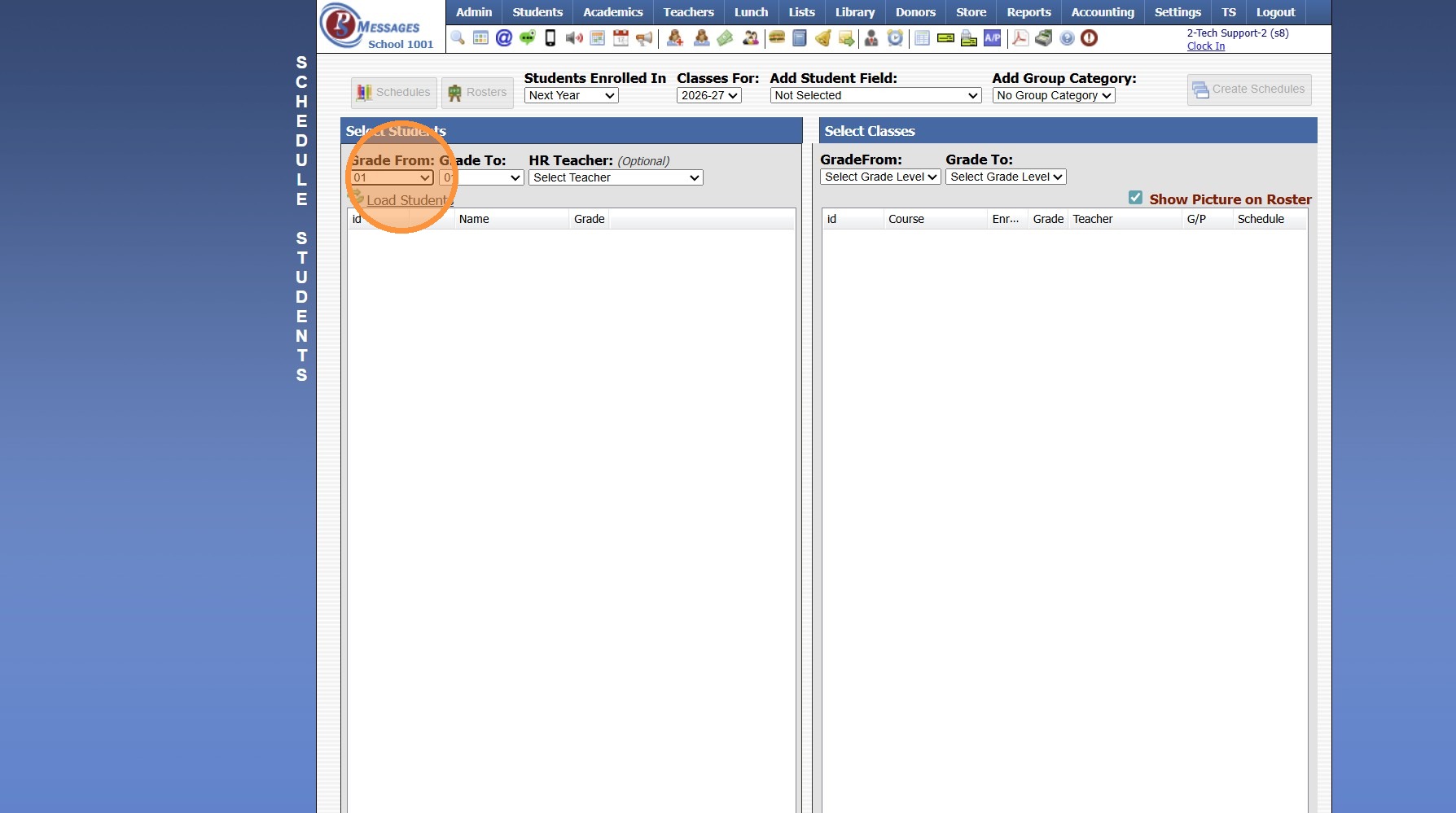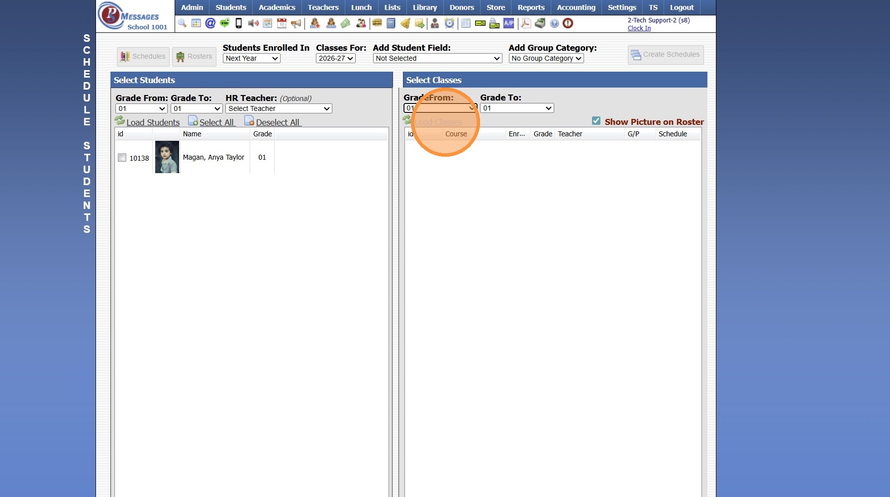 Scheduling Students into Classes by Grade Level 1. Log into PraxiSchool 2. Click "Academics" 3. Click "Grades Tasks" 4. Click "Schedule Students" 5. Current Year is the Default Option for Students Enrolled In (Select Summer or Next Year if scheduling ...