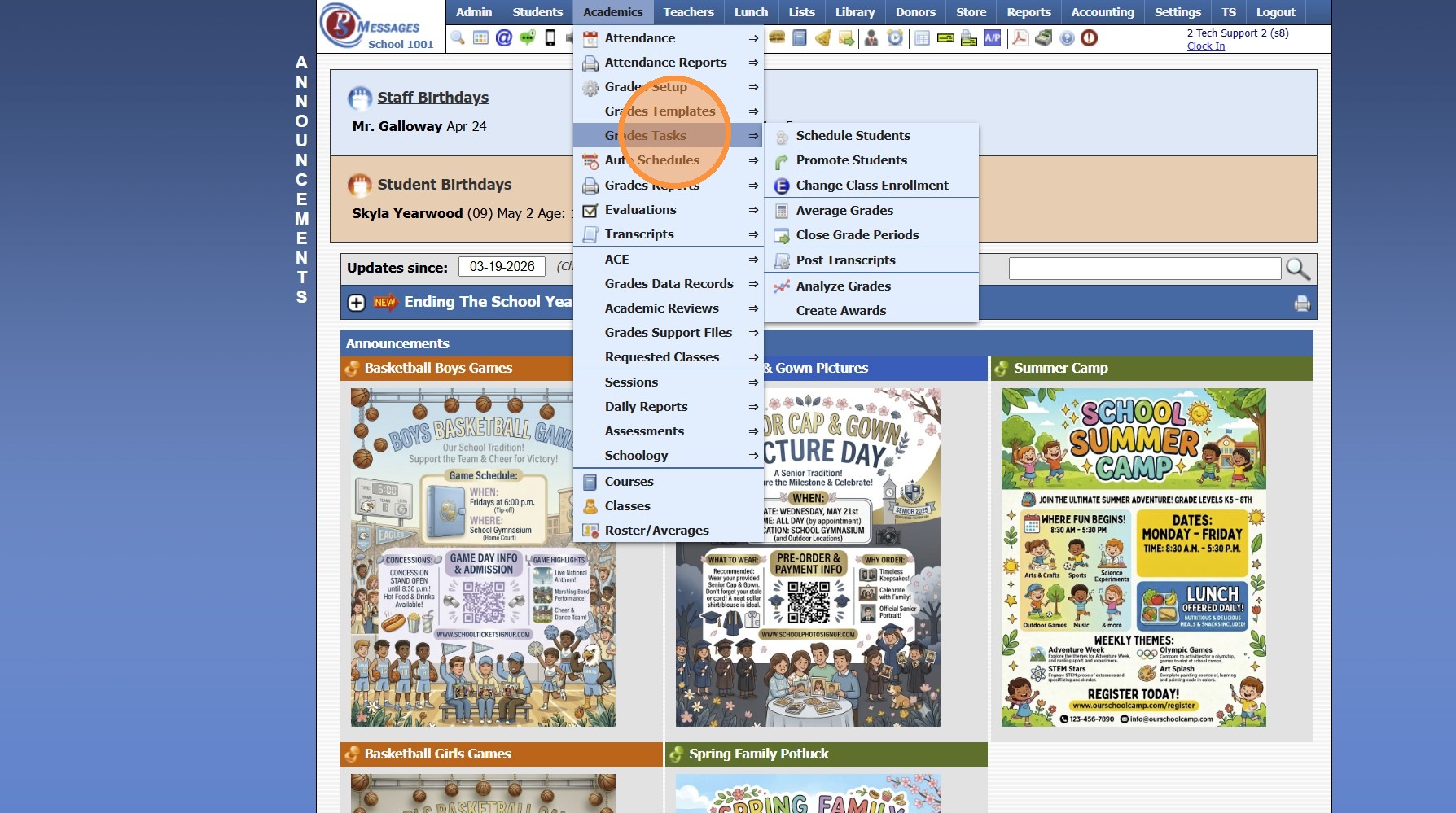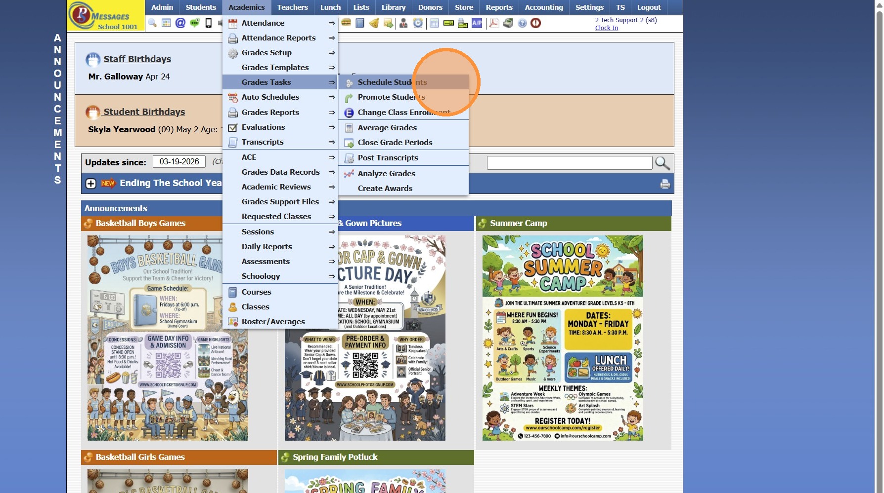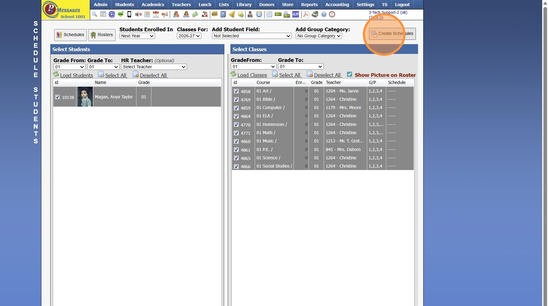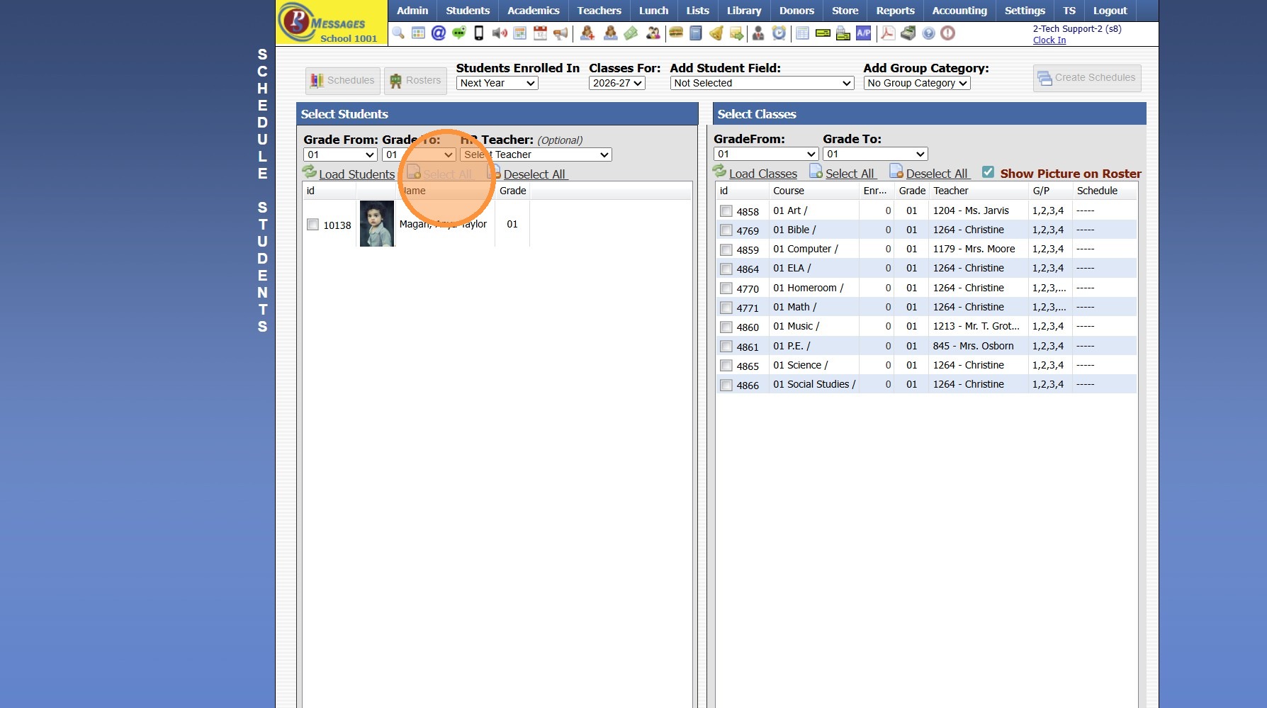 Scheduling Students into Classes by Grade Level 1. Log into PraxiSchool 2. Click "Academics" 3. Click "Grades Tasks" 4. Click "Schedule Students" 5. Current Year is the Default Option for Students Enrolled In (Select Summer or Next Year if scheduling ...