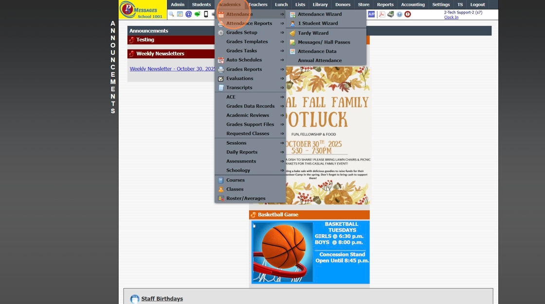 Issuing a Hall Pass (Attendance Tardy Wizard) 1. Click "Academics" 2. Click "Attendance" 3. Click "Message / Hall Passes" 4. Select Student 5. Select Room From and Room To (Optional) 6. Select Staff to Receive Message 7. Select Message Options: For ...
