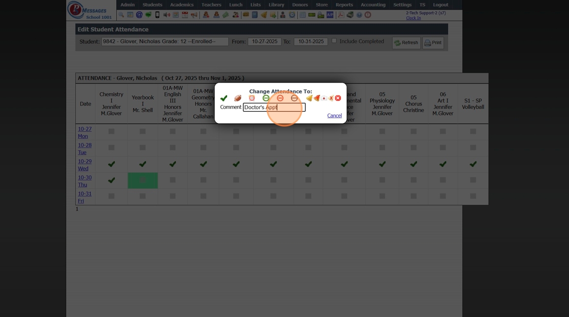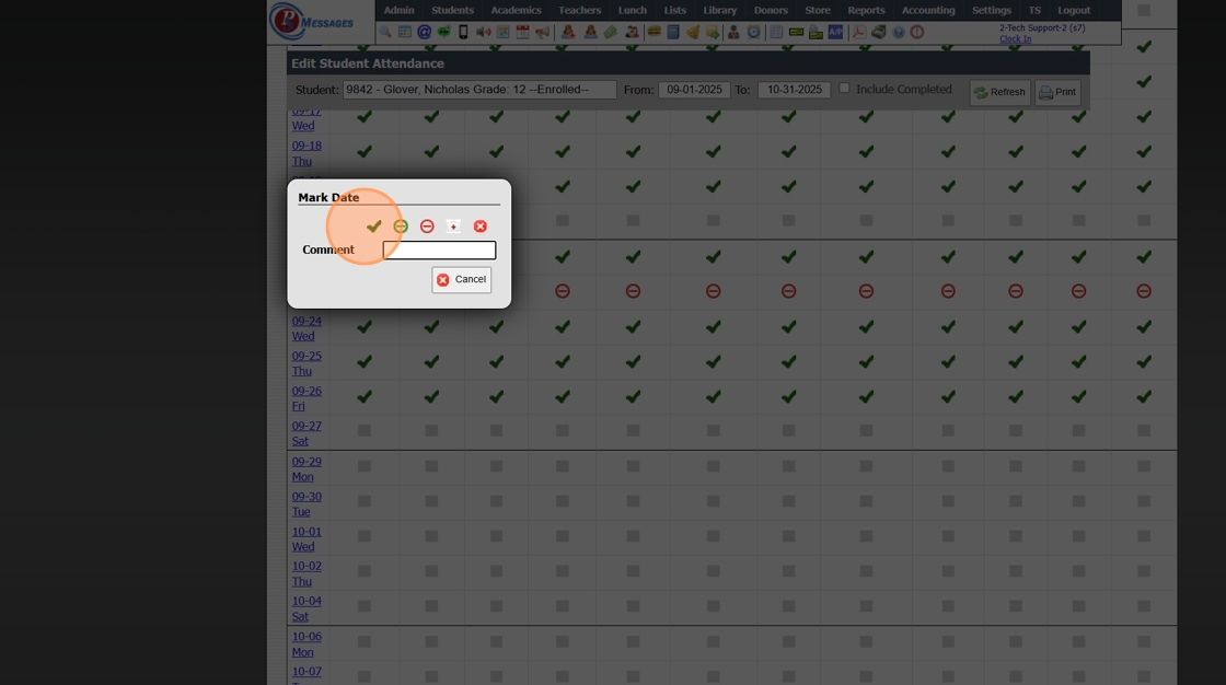 Using the Tardy Wizard (Attendance Tardy Wizard) 1. Click "Academics" 2. Click "Attendance" 3. Click "Tardy Wizard" 4. Select Student 5. Enter Reason (Optional) 6. Select Class 7. Select "Notify Teacher" to Send Teacher a Message 8. Select Excused or ...
