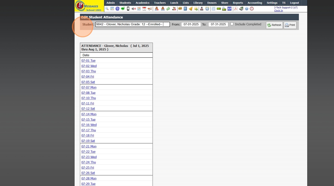 Attendance Report - Student Reports 1. Click "Academics" 2. Click "Attendance Reports" 3. Click "Student Reports" 4. Set Date From and Date To 5. Click "Select All" 6. Click "Print" 7. Attendance Report will Generate to be Printed, Emailed of Saved ...