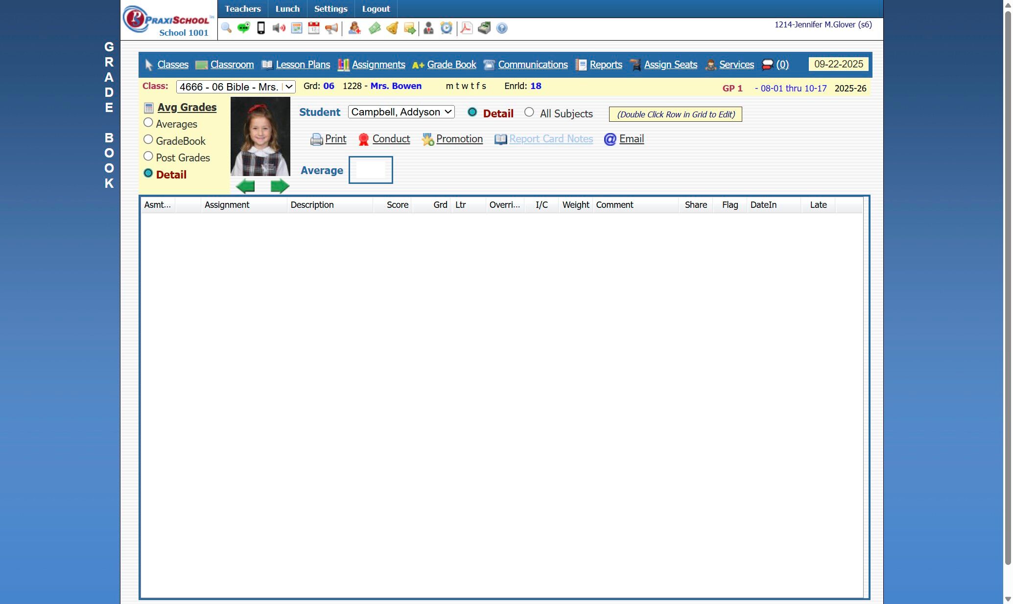 Entering Student Conduct 1. Log into PraxiSchool 2. Click "Teachers" 3. Click "Classroom" 4. Select Class 5. Click "Grade Book" 6. Click "Detail" Toggle 7. Select Student 8. Click "Conduct" 9. Enter Letter Grade for Each Item 10. Make sure to Tab out ...
