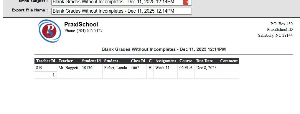Generating Grade Reports Grade Reports for Incomplete Grades, Blank Grades (Not Marked Incomplete) and Zero Weight. 1. Log into PraxiSchool 2. Click "Academics" 3. Click "Grades Reports" 4. Click "Incomplete Grades" Incomplete Grades Report 5. Select ...