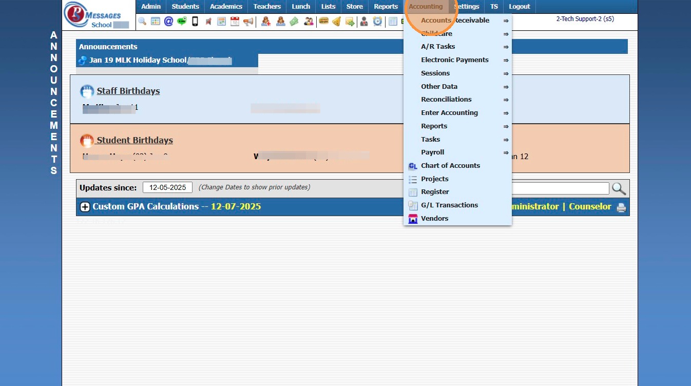 Posting a Returned Check/ACH in Accounts Receivable 1. Log into PraxiSchool 2. Click "Admin" 3. Click "Accounts Receivable" 4. Select AR Account 5. Click "Actions" 6. Click "Post Returned Check" 7. Enter Returned Check Date 8. Enter Check Number or ...